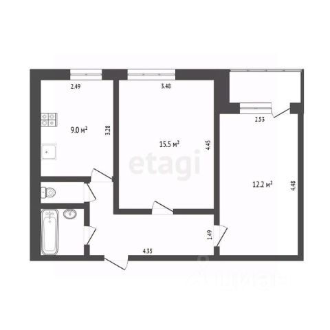 Двухкомнатная квартира в районе Дом Обороны. Площадь квартиры 45 кв.м, на втором этаже. Жилая площадь 26,4 кв.м. Комнаты изолированные, правильной формы (11,0 и 15,4 кв.м), меньшая комната с выходом на лоджию. Кухня 6 кв.м. Санузел совмещенный (4 кв.и). Окна выходят во двор, поэтому квартира защищена от внешнего шума. Большая прихожая 8 кв.м.