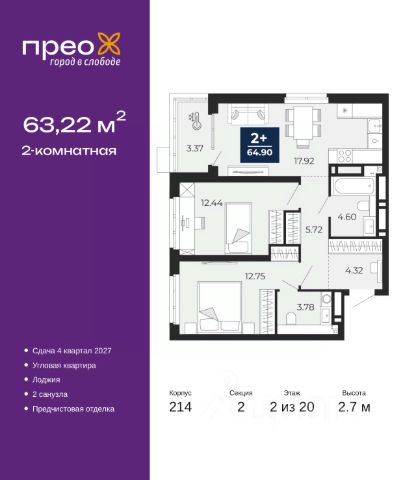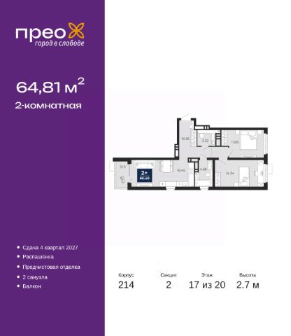 Двухкомнатная квартира от застройщика с предчистовой отделкой в ЖК "Прео" на 17 этаже. Общая площадь: 64.81 кв.м., жилая: 26.23 кв.м., площадь просторной кухни-столовой: 18.45 кв.м. Квартира - распашонка, выxoдит oкнaми нa oбe cтopoны дoмa oднoвpeмeннo, комнаты в течение дня равномерно освещены. В квартире один балкон, один совмещенный и один раздельный санузел. Высота потолков 2.7 м.