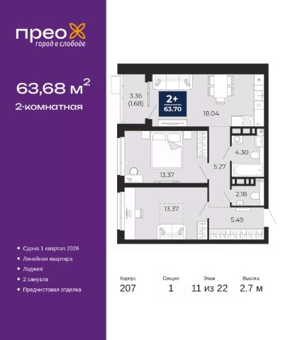 2-комн. квартира от застройщика с предчистовой отделкой в ЖК "Прео" на 13 этаже. Общая площадь: 58.99 кв.м., жилая: 22.23 кв.м., площадь просторной кухни-столовой: 17.51 кв.м. Квартира угловая, очень светлая, естественная вентиляция при открытии окон. В квартире одна лоджия, два совмещенных санузла. Высота потолков 2.7 м.