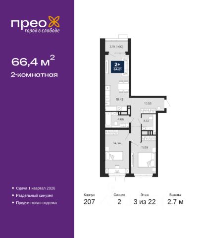 2-комн. квартира от застройщика в ЖК "Прео" на 2 этаже. Общая площадь: 64.9 кв.м. Высота потолков 2.7 м. Дом монолитный, двухподъездный, переменной этажности, от 12 до 20 этажей. Квартира находится во 2-й секции высотой 20 этажей в корпусе 214. На этаже 8 квартир. В подъезде 1 пассажирский и 1 грузовой лифт. Окончание строительства - 4 квартал 2027 года. Оформление сделки по договору долевого участия. Преображенский — один из самых привлекательных районов для жизни! Это полностью самостоятельный жилой район с точки зрения инфраструктуры. Преображенский находится между Московским и Червишевским трактами в квартале улиц Закалужская — Вьюжная — Александра Протозанова. Не нужно ждать, когда появится инфраструктура — переезжайте на всё готовое. Вблизи расположены действующие школа и детский сад. В этом году откроется еще один сад, а в следующем году — школа. По соседству с Преображенским запланировано строительство городского парка "Комарово" площадью 38 гектар. За 10 минут можно доехать на автомобиле до крупных ТРЦ: "Лента", "Кристалл", "Леруа Мерлен", "Метро" и "Ашан". С 2018 года в районе открыт Соседский центр — пространство, созданное для формирования добрососедской среды, совместного досуга, общения и реализации соседских инициатив. Здесь проходят встречи соседей, а также сами жители района организовывают мероприятия. Организатором такого события может стать любой желающий. В квартирах выполнена качественная предчистовая отделка. Гладкие стены с финишным выравниванием по маякам. Ровный потолок для установки натяжного потолка. Установлены пятикамерные окна с двойным стеклопакетом (3 стекла). Дизайнерские холлы с видеонаблюдением, безбарьерным и прозрачным входом всегда светло и спокойно. На первом этаже есть просторные колясочные, где все жители могут оставлять свои коляски и велосипеды. В Преображенском есть всё, что нужно для активного отдыха и занятий спортом. Мы сделали большое футбольное поле с безопасным покрытием. Также установили хоккейный корт, который оборудован по всем необходимым стандартам. Во дворах можно делать упражнения на специальных площадках с турниками. Весь район мы обустроили велодорожками, которые связаны в единый маршрут. У нас есть сухие фонтаны, бьющие из земли, деревья, веревки, сетки, скалодром, газон, песок и резинка — осталось просто дать своему ребенку право на свободную игру. По-настоящему хорошие дворы — это те, которые дети предпочитают соцсетям и телевизору. Аккредитация в банках: ПАО "Газпромбанк", ПАО Банк "ВТБ", ОАО "Альфа-Банк", ПАО "Банк Уралсиб", "Сбербанк России" и других. #2MdFDm