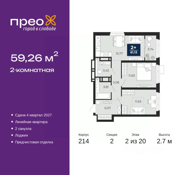2-комн. квартира с предчистовой отделкой в ЖК "Прео" на 2 этаже. Общая площадь: 63.68 кв.м., жилая: 26.74 кв.м., площадь просторной кухни-столовой: 18.04 кв.м. Комнаты изолированные, все окна выходят на одну сторону. В квартире одна лоджия, один совмещенный и один раздельный санузел. Высота потолков 2.7 м. Дом монолитный, двухподъездный, переменной этажности, от 12 до 20 этажей. Квартира находится в 1-й секции высотой 12 этажей в корпусе 214. На этаже 8 квартир. В подъезде 1 пассажирский и 1 грузовой лифт. Окончание строительства - 4 квартал 2027 года. Оформление сделки по договору долевого участия. Преображенский — один из самых привлекательных районов для жизни! Это полностью самостоятельный жилой район с точки зрения инфраструктуры. Преображенский находится между Московским и Червишевским трактами в квартале улиц Закалужская — Вьюжная — Александра Протозанова. Не нужно ждать, когда появится инфраструктура — переезжайте на всё готовое. Вблизи расположены действующие школа и детский сад. В этом году откроется еще один сад, а в следующем году — школа. По соседству с Преображенским запланировано строительство городского парка "Комарово" площадью 38 гектар. За 10 минут можно доехать на автомобиле до крупных ТРЦ: "Лента", "Кристалл", "Леруа Мерлен", "Метро" и "Ашан". С 2018 года в районе открыт Соседский центр — пространство, созданное для формирования добрососедской среды, совместного досуга, общения и реализации соседских инициатив. Здесь проходят встречи соседей, а также сами жители района организовывают мероприятия. Организатором такого события может стать любой желающий. В квартирах выполнена качественная предчистовая отделка. Гладкие стены с финишным выравниванием по маякам. Ровный потолок для установки натяжного потолка. Установлены пятикамерные окна с двойным стеклопакетом (3 стекла). Дизайнерские холлы с видеонаблюдением, безбарьерным и прозрачным входом всегда светло и спокойно. На первом этаже есть просторные колясочные, где все жители могут оставлять свои коляски и велосипеды. В Преображенском есть всё, что нужно для активного отдыха и занятий спортом. Мы сделали большое футбольное поле с безопасным покрытием. Также установили хоккейный корт, который оборудован по всем необходимым стандартам. Во дворах можно делать упражнения на специальных площадках с турниками. Весь район мы обустроили велодорожками, которые связаны в единый маршрут. У нас есть сухие фонтаны, бьющие из земли, деревья, веревки, сетки, скалодром, газон, песок и резинка — осталось просто дать своему ребенку право на свободную игру. По-настоящему хорошие дворы — это те, которые дети предпочитают соцсетям и телевизору. Аккредитация в банках: ПАО "Газпромбанк", ПАО "Банк Уралсиб", ПАО Банк "ВТБ", ОАО "Альфа-Банк", "Сбербанк России" и других. #ZM8g66