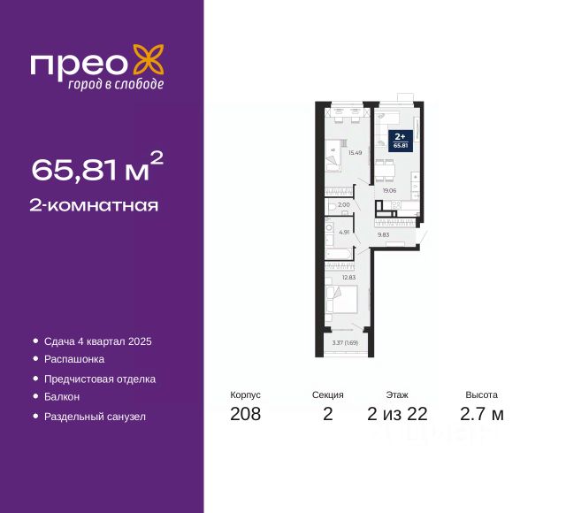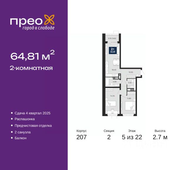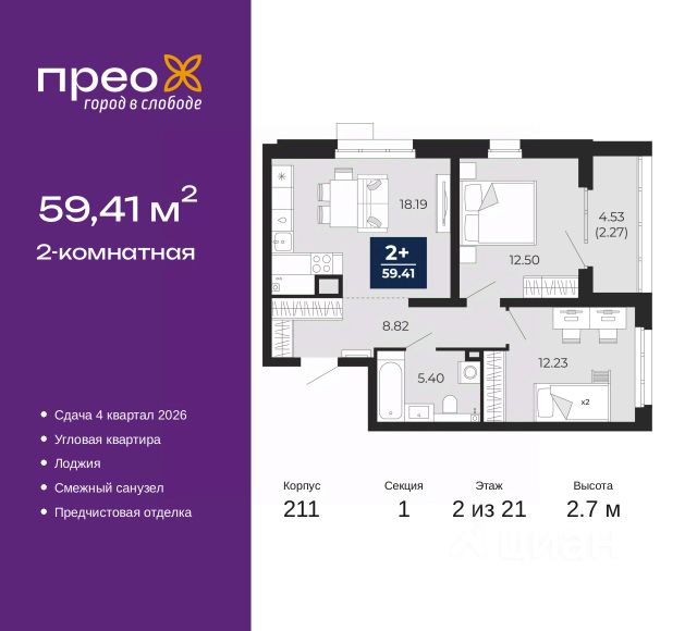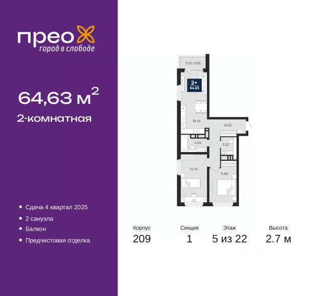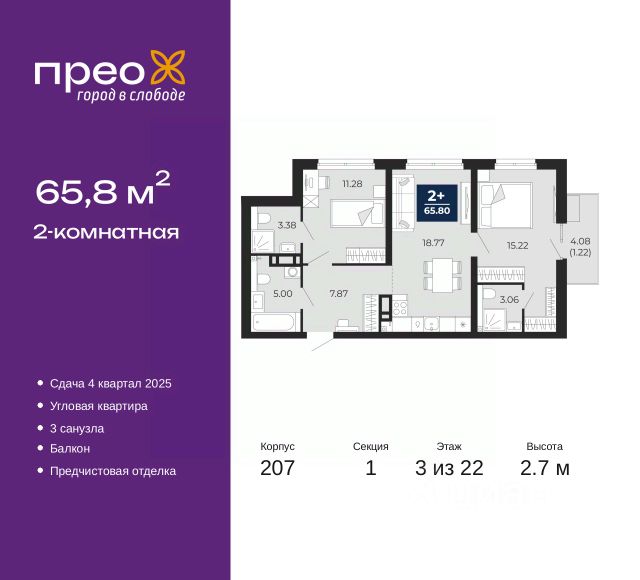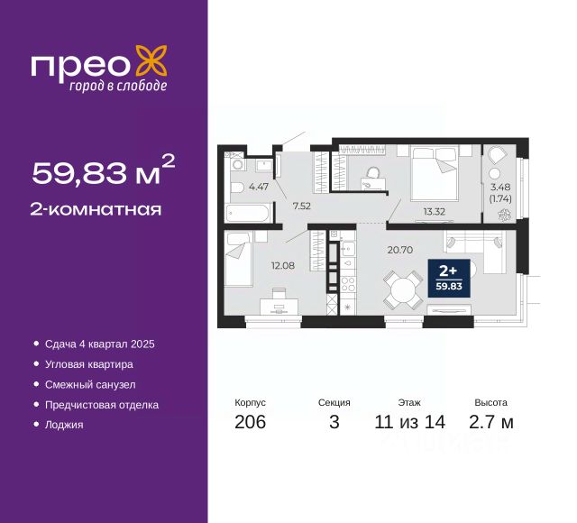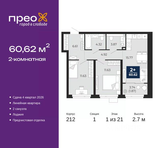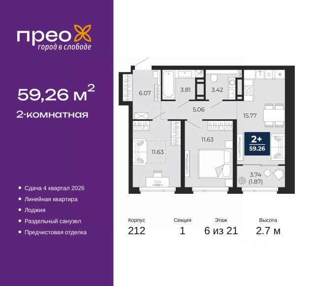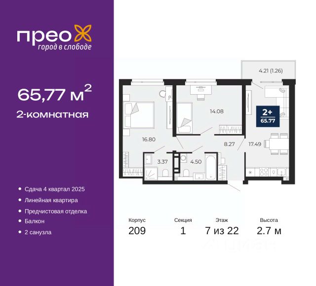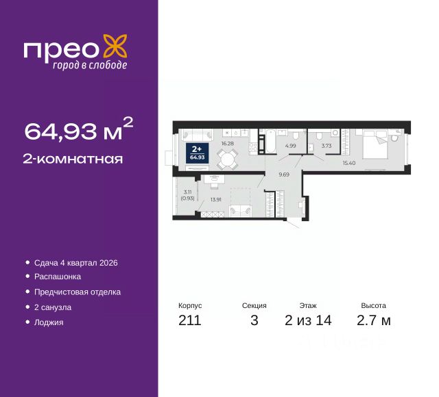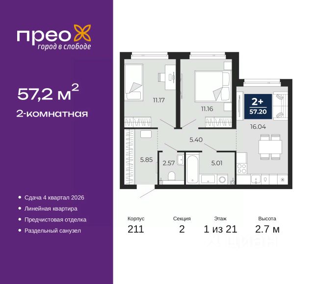2-комн. квартира от застройщика с предчистовой отделкой в ЖК "Прео" на 20 этаже. Общая площадь: 54.64 кв.м., жилая: 26.99 кв.м., площадь просторной кухни-столовой: 13.51 кв.м. Комнаты изолированные, все окна выходят на одну сторону. В квартире одна лоджия, один совмещенный санузел. Высота потолков 2.7 м. Дом монолитный, черырехподъездный, переменной этажности, от 14 до 21 этажей. Квартира находится во 2-й секции высотой 21 этаж в корпусе 211. На этаже 10 квартир. В подъезде 1 пассажирский и 1 грузовой лифт. Окончание строительства - 4 квартал 2026 года. Оформление сделки по договору долевого участия. Преображенский — один из самых привлекательных районов для жизни! Это полностью самостоятельный жилой район с точки зрения инфраструктуры. Преображенский находится между Московским и Червишевским трактами в квартале улиц Закалужская — Вьюжная — Александра Протозанова. Не нужно ждать, когда появится инфраструктура — переезжайте на всё готовое. Вблизи расположены действующие школа и детский сад. В этом году откроется еще один сад, а в следующем году — школа. По соседству с Преображенским запланировано строительство городского парка "Комарово" площадью 38 гектар. За 10 минут можно доехать на автомобиле до крупных ТРЦ: "Лента", "Кристалл", "Леруа Мерлен", "Метро" и "Ашан". С 2018 года в районе открыт Соседский центр — пространство, созданное для формирования добрососедской среды, совместного досуга, общения и реализации соседских инициатив. Здесь проходят встречи соседей, а также сами жители района организовывают мероприятия. Организатором такого события может стать любой желающий. В квартирах выполнена качественная предчистовая отделка. Гладкие стены с финишным выравниванием по маякам. Ровный потолок для установки натяжного потолка. Установлены пятикамерные окна с двойным стеклопакетом (3 стекла). Дизайнерские холлы с видеонаблюдением, безбарьерным и прозрачным входом всегда светло и спокойно. На первом этаже есть просторные колясочные, где все жители могут оставлять свои коляски и велосипеды. В Преображенском есть всё, что нужно для активного отдыха и занятий спортом. Мы сделали большое футбольное поле с безопасным покрытием. Также установили хоккейный корт, который оборудован по всем необходимым стандартам. Во дворах можно делать упражнения на специальных площадках с турниками. Весь район мы обустроили велодорожками, которые связаны в единый маршрут. У нас есть сухие фонтаны, бьющие из земли, деревья, веревки, сетки, скалодром, газон, песок и резинка — осталось просто дать своему ребенку право на свободную игру. По-настоящему хорошие дворы — это те, которые дети предпочитают соцсетям и телевизору. Аккредитация в банках: ОАО "Альфа-Банк", ПАО "Банк Уралсиб", "Сбербанк России", ПАО "Газпромбанк", ПАО Банк "ВТБ" и других. #zSOAca