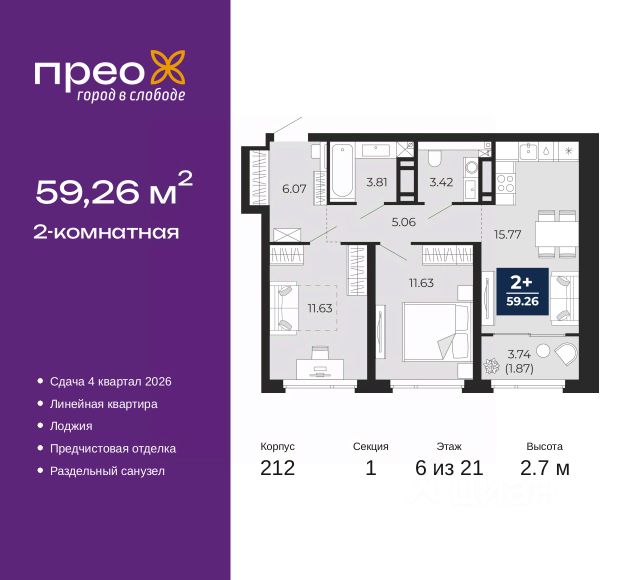 Продается 2-комн. квартира с предчистовой отделкой в ЖК "Прео" на 20 этаже. Общая площадь: 54.64 кв.м., жилая: 26.99 кв.м., площадь просторной кухни-столовой: 13.51 кв.м. Комнаты изолированные, все окна выходят на одну сторону. В квартире одна лоджия, один совмещенный санузел. Высота потолков 2.7 м. Дом монолитный, черырехподъездный, переменной этажности, от 14 до 21 этажей. Квартира находится во 2-й секции высотой 21 этаж в корпусе 211. На этаже 10 квартир. В подъезде 1 пассажирский и 1 грузовой лифт. Окончание строительства - 4 квартал 2026 года. Оформление сделки по договору долевого участия. Преображенский — один из самых привлекательных районов для жизни! Это полностью самостоятельный жилой район с точки зрения инфраструктуры. Преображенский находится между Московским и Червишевским трактами в квартале улиц Закалужская — Вьюжная — Александра Протозанова. Не нужно ждать, когда появится инфраструктура — переезжайте на всё готовое. Вблизи расположены действующие школа и детский сад. В этом году откроется еще один сад, а в следующем году — школа. По соседству с Преображенским запланировано строительство городского парка "Комарово" площадью 38 гектар. За 10 минут можно доехать на автомобиле до крупных ТРЦ: "Лента", "Кристалл", "Леруа Мерлен", "Метро" и "Ашан". С 2018 года в районе открыт Соседский центр — пространство, созданное для формирования добрососедской среды, совместного досуга, общения и реализации соседских инициатив. Здесь проходят встречи соседей, а также сами жители района организовывают мероприятия. Организатором такого события может стать любой желающий. В квартирах выполнена качественная предчистовая отделка. Гладкие стены с финишным выравниванием по маякам. Ровный потолок для установки натяжного потолка. Установлены пятикамерные окна с двойным стеклопакетом (3 стекла). Дизайнерские холлы с видеонаблюдением, безбарьерным и прозрачным входом всегда светло и спокойно. На первом этаже есть просторные колясочные, где все жители могут оставлять свои коляски и велосипеды. В Преображенском есть всё, что нужно для активного отдыха и занятий спортом. Мы сделали большое футбольное поле с безопасным покрытием. Также установили хоккейный корт, который оборудован по всем необходимым стандартам. Во дворах можно делать упражнения на специальных площадках с турниками. Весь район мы обустроили велодорожками, которые связаны в единый маршрут. У нас есть сухие фонтаны, бьющие из земли, деревья, веревки, сетки, скалодром, газон, песок и резинка — осталось просто дать своему ребенку право на свободную игру. По-настоящему хорошие дворы — это те, которые дети предпочитают соцсетям и телевизору. Аккредитация в банках: ПАО Банк "ВТБ", "Сбербанк России", ОАО "Альфа-Банк", ПАО "Газпромбанк", ПАО "Банк Уралсиб" и других. #zSOAcA