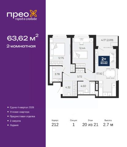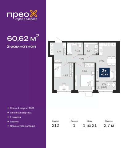2-комн. квартира с предчистовой отделкой в ЖК "Прео" на 10 этаже. Общая площадь: 54.64 кв.м., жилая: 26.99 кв.м., площадь просторной кухни-столовой: 13.51 кв.м. Комнаты изолированные, все окна выходят на одну сторону. В квартире одна лоджия, один совмещенный санузел. Высота потолков 2.7 м. Дом монолитный, черырехподъездный, переменной этажности, от 14 до 21 этажей. Квартира находится во 2-й секции высотой 21 этаж в корпусе 211. На этаже 10 квартир. В подъезде 1 пассажирский и 1 грузовой лифт. Окончание строительства - 4 квартал 2026 года. Оформление сделки по договору долевого участия. Преображенский — один из самых привлекательных районов для жизни! Это полностью самостоятельный жилой район с точки зрения инфраструктуры. Преображенский находится между Московским и Червишевским трактами в квартале улиц Закалужская — Вьюжная — Александра Протозанова. Не нужно ждать, когда появится инфраструктура — переезжайте на всё готовое. Вблизи расположены действующие школа и детский сад. В этом году откроется еще один сад, а в следующем году — школа. По соседству с Преображенским запланировано строительство городского парка "Комарово" площадью 38 гектар. За 10 минут можно доехать на автомобиле до крупных ТРЦ: "Лента", "Кристалл", "Леруа Мерлен", "Метро" и "Ашан". С 2018 года в районе открыт Соседский центр — пространство, созданное для формирования добрососедской среды, совместного досуга, общения и реализации соседских инициатив. Здесь проходят встречи соседей, а также сами жители района организовывают мероприятия. Организатором такого события может стать любой желающий. В квартирах выполнена качественная предчистовая отделка. Гладкие стены с финишным выравниванием по маякам. Ровный потолок для установки натяжного потолка. Установлены пятикамерные окна с двойным стеклопакетом (3 стекла). Дизайнерские холлы с видеонаблюдением, безбарьерным и прозрачным входом всегда светло и спокойно. На первом этаже есть просторные колясочные, где все жители могут оставлять свои коляски и велосипеды. В Преображенском есть всё, что нужно для активного отдыха и занятий спортом. Мы сделали большое футбольное поле с безопасным покрытием. Также установили хоккейный корт, который оборудован по всем необходимым стандартам. Во дворах можно делать упражнения на специальных площадках с турниками. Весь район мы обустроили велодорожками, которые связаны в единый маршрут. У нас есть сухие фонтаны, бьющие из земли, деревья, веревки, сетки, скалодром, газон, песок и резинка — осталось просто дать своему ребенку право на свободную игру. По-настоящему хорошие дворы — это те, которые дети предпочитают соцсетям и телевизору. Аккредитация в банках: ПАО Банк "ВТБ", ПАО "Банк Уралсиб", ОАО "Альфа-Банк", "Сбербанк России", ПАО "Газпромбанк" и других. #ZsoaDM