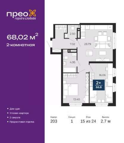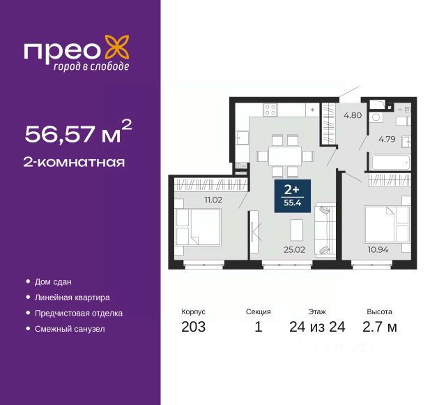 Двухкомнатная квартира от застройщика с предчистовой отделкой в ЖК "Прео" на 24 этаже. Общая площадь: 56.57 кв.м., жилая: 21.96 кв.м., площадь просторной кухни-столовой: 25.02 кв.м. Комнаты изолированные, все окна выходят на одну сторону. В квартире один совмещенный санузел. Высота потолков 2.7 м. Квартира находится в корпусе 203. Дом монолитный, одноподъездный, высотой 24 этажа. На этаже 14 квартир. В подъезде 2 грузовых лифта. В настоящее время строительство окончено, дом сдан в 4 квартале 2024 года. Оформление сделки по договору купли-продажи. Преображенский — один из самых привлекательных районов для жизни! Это полностью самостоятельный жилой район с точки зрения инфраструктуры. Преображенский находится между Московским и Червишевским трактами в квартале улиц Закалужская — Вьюжная — Александра Протозанова. Не нужно ждать, когда появится инфраструктура — переезжайте на всё готовое. Вблизи расположены действующие школа и детский сад. В этом году откроется еще один сад, а в следующем году — школа. По соседству с Преображенским запланировано строительство городского парка "Комарово" площадью 38 гектар. За 10 минут можно доехать на автомобиле до крупных ТРЦ: "Лента", "Кристалл", "Леруа Мерлен", "Метро" и "Ашан". С 2018 года в районе открыт Соседский центр — пространство, созданное для формирования добрососедской среды, совместного досуга, общения и реализации соседских инициатив. Здесь проходят встречи соседей, а также сами жители района организовывают мероприятия. Организатором такого события может стать любой желающий. В квартирах выполнена качественная предчистовая отделка. Гладкие стены с финишным выравниванием по маякам. Ровный потолок для установки натяжного потолка. Установлены пятикамерные окна с двойным стеклопакетом (3 стекла). Дизайнерские холлы с видеонаблюдением, безбарьерным и прозрачным входом всегда светло и спокойно. На первом этаже есть просторные колясочные, где все жители могут оставлять свои коляски и велосипеды. В Преображенском есть всё, что нужно для активного отдыха и занятий спортом. Мы сделали большое футбольное поле с безопасным покрытием. Также установили хоккейный корт, который оборудован по всем необходимым стандартам. Во дворах можно делать упражнения на специальных площадках с турниками. Весь район мы обустроили велодорожками, которые связаны в единый маршрут. У нас есть сухие фонтаны, бьющие из земли, деревья, веревки, сетки, скалодром, газон, песок и резинка — осталось просто дать своему ребенку право на свободную игру. По-настоящему хорошие дворы — это те, которые дети предпочитают соцсетям и телевизору. Аккредитация в банках: ПАО "Банк Уралсиб", ОАО "Альфа-Банк", "Сбербанк России", ПАО "Газпромбанк", ПАО Банк "ВТБ" и других. #ZZC4CM