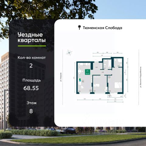 Двухкомнатная квартира с предчистовой отделкой в ЖК "Уездные кварталы" на 8 этаже. Общая площадь: 68.55 кв.м., жилая: 28.52 кв.м., площадь просторной кухни-столовой: 21.39 кв.м. Комнаты изолированные, все окна выходят на одну сторону. В квартире один балкон, два совмещенных санузла. Высота потолков 2.7 м. Дом монолитный, многоподъездный, переменной этажности, от 7 до 17 этажей. Квартира находится во 2-й секции высотой 12 этажей в корпусе ГП-3. На этаже 11 квартир. В подъезде 1 пассажирский и 1 грузовой лифт. Окончание строительства - 1 квартал 2026 года. Оформление сделки по договору долевого участия. "Уездные кварталы" - семейный жилой комплекс комфорт-класса с авторской архитектурой и трехуровневым ландшафтным озеленением. Рядом расположены крупные транспортные развязки, которые позволяют добраться в любую точку города за 15 минут. Жилой комплекс находится в современном районе с развитой инфраструктурой, на первой линии Тюменской Слободы. Вокруг есть всё необходимое в шаговой доступности: новые детские сады и школы, остановки общественного транспорта, магазины, кафе и рестораны, поликлиника, детская школа искусств, парки и спортивный комплекс. На первых этажах квартала расположена собственная коммерческая сеть, а также свой соседский центр. Проект включает 5 домов переменной этажности с более чем 100 планировками - с террасами, французскими балконами и мастер-спальнями. Закрытые дворы оборудованы интерактивными площадками для игр, спортивными зонами и местами тихого отдыха. Вдоль жилого комплекса расположен пешеходный бульвар с сухим фонтаном, а для автомобилей предусмотрен теплый паркинг. Часть квартир можно приобрести с ремонтом, мебелью и техникой от застройщика, а расходы включить в ипотечный платеж. #ZmScMc