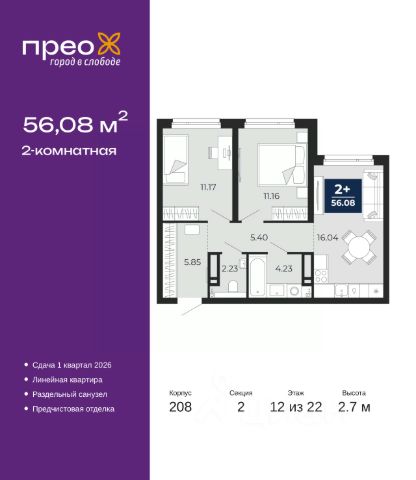 Двухкомнатная квартира с европланировкой и предчистовой отделкой в ЖК "Уездные кварталы" на 8 этаже. Общая площадь: 52.9 кв.м., жилая: 24.1 кв.м., суммарная площадь гостиной-столовой с кухонной зоной: 22.5 кв.м. Европейская планировка, кухня-гостиная - идеальный вариант для тех, кто любит часто принимать гостей. Угловая квартира, очень светлая, естественная вентиляция при открытии окон. В квартире одна лоджия, один совмещенный санузел. Высота потолков 2.72 м. Дом монолитный, черырехподъездный, переменной этажности, от 9 до 16 этажей. Квартира находится в 3-й секции высотой 9 этажей в корпусе ГП-5.2. На этаже 4 квартиры. В подъезде 1 пассажирский и 1 грузовой лифт. Окончание строительства - 4 квартал 2026 года. Оформление сделки по договору долевого участия. "Уездные кварталы" - семейный жилой комплекс комфорт-класса с авторской архитектурой и трехуровневым ландшафтным озеленением. Рядом расположены крупные транспортные развязки, которые позволяют добраться в любую точку города за 15 минут. Жилой комплекс находится в современном районе с развитой инфраструктурой, на первой линии Тюменской Слободы. Вокруг есть всё необходимое в шаговой доступности: новые детские сады и школы, остановки общественного транспорта, магазины, кафе и рестораны, поликлиника, детская школа искусств, парки и спортивный комплекс. На первых этажах квартала расположена собственная коммерческая сеть, а также свой соседский центр. Проект включает 5 домов переменной этажности с более чем 100 планировками - с террасами, французскими балконами и мастер-спальнями. Закрытые дворы оборудованы интерактивными площадками для игр, спортивными зонами и местами тихого отдыха. Вдоль жилого комплекса расположен пешеходный бульвар с сухим фонтаном, а для автомобилей предусмотрен теплый паркинг. Часть квартир можно приобрести с ремонтом, мебелью и техникой от застройщика, а расходы включить в ипотечный платеж. #zmseIV