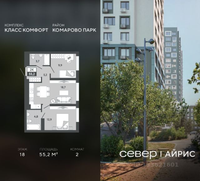 Продаётся квартира площадью 55.2 м2 в жилом комплексе "Айрис". Квартира находится на 19 этаже, жилая площадь квартиры 22.8 м2, площадь просторной кухни — 18.7 м2. Среди особенностей планировки — изолированные комнаты с окнами на одну сторону, 1 совмещённый санузел. Срок сдачи — III кв. 2027 "Айрис" — Смарт-квартал для активной и комфортной жизни "Айрис" расположен в новом экологически чистом районе Комарово Парк — локации без промышленного прошлого,в окружении трёх зелёных парков, до которых можно дойти за 10 минут. Здесь свежий воздух, природа и тишина сочетаются с городским комфортом. Рядом вся ключевая инфраструктура: ТРЦ "Колумб" и "Кристалл", Гимназия 4, Академия спорта, детские сады 60 и 95. Смарт-архитектура обеспечивает хорошие виды и естественное освещение. Разновысотная застройка формирует ощущение открытого пространства, а панорамные окна наполняют квартиры светом. Дворы без машин — безопасные игровые и спортивные зоны, зелёные пространства, места для отдыха и спорта. Большой выбор планировок — от студий до трёхкомнатных квартир, а также редкие форматы: террасы, зимние сады и сити-хаусы. Дополнительные удобства — кладовые на этажах, лаундж-парадные, два наземных паркинга. Продуманная транспортная доступность Благодаря продуманной транспортной доступности "Айрис" одинаково удобен и для автомобилистов, и для тех, кто пользуется общественным транспортом. Район остаётся тихим, при этом сохраняется связь с основными направлениями города: • 2025 минут до центра Тюмени • 67 минут до объездной дороги • 5 минут до Московского тракта Смарт-пространство для жизни без компромиссов "Айрис" предлагает продуманные пространства, которые поддерживают комфортный и активный образ жизни. На крышах паркингов размещены лайфстайл-зоны: площадки для тренировок, кинотеатр под открытым небом, зелёные террасы для йоги и отдыха — всё, что нужно для активной городской жизни рядом с домом. Максимум света и воздуха в каждой квартире Пространственные решения усиливают ощущение простора: • панорамные окна высотой 1,652,4 м; • витражные балконы и лоджии, расширяющие визуальные границы; • потолки от 2,72 м на типовых этажах до 4,62 м на первом. Многофункциональные крыши паркингов: новый уровень городской инфраструктуры Жители "Айрис" могут заниматься спортом, отдыхать и встречаться на свежем воздухе. — прямо на крышах паркингов. Здесь расположены: • воркаут-зона с тренажёрами и цифровыми программами тренировок — поддерживать форму можно рядом с домом; • кинотеатр под открытым небом, который летом становится центром вечерней жизни квартала; • зелёные террасы — тихие места для отдыха, чтения и встреч; • йога-терраса, где удобнее всего заниматься на рассвете и закате.