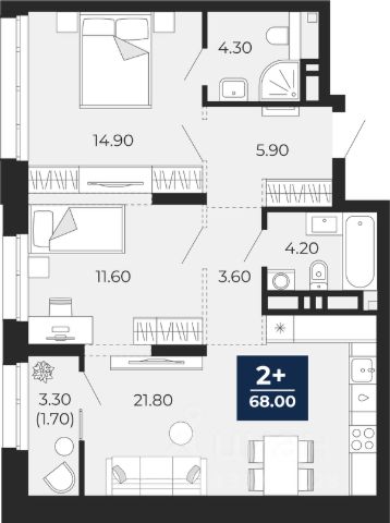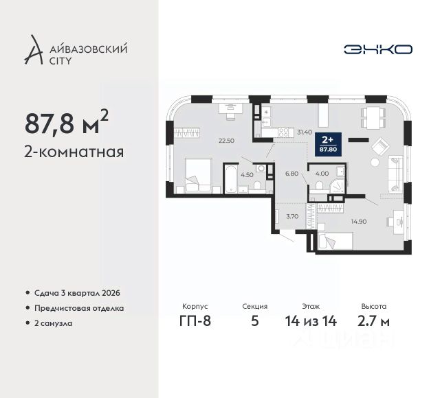 2-комн. квартира с предчистовой отделкой в ЖК "Айвазовский City" на 3 этаже. Общая площадь: 68 кв.м., жилая: 26.5 кв.м., площадь просторной кухни-столовой: 21.8 кв.м. Квартира угловая, очень светлая, естественная вентиляция при открытии окон. В квартире одна лоджия, два совмещенных санузла. Высота потолков 2.7 м. Дом монолитный, многоподъездный, переменной этажности, от 14 до 24 этажей. Квартира находится в 3-й секции высотой 24 этажа в корпусе ГП-8. На этаже 7 квартир. В подъезде 1 пассажирский и 1 грузовой лифт. Окончание строительства - 3 квартал 2026 года. Оформление сделки по договору долевого участия. Новый жилой район располагается в живописном месте на берегу Туры в центральной части города. Принципиально новое пространство для жизни в центре современного города для тех, чьи мечты сбываются, кто нацелен на постоянный рост, перемены к лучшему для себя и своих близких. Каждая деталь Айвазовский City вдохновляет и заряжает на новые свершения: авторская архитектура, сбалансированная продуманная инфраструктура, дизайнерские дворы со спортивными и детскими площадками, парковые зоны с фонтанами, водный канал, украшающий центральный прогулочный маршрут района и многое другое. В 2019 года проект стал лауреатом престижной премии Urban Awards 2019 в номинации "Лучший строящийся региональный жилой комплекс бизнес-класса". Главная особенность Айвазовский City - соседство разных архитектурных школ в рамках одного дома. Изысканная классика, выразительная эклектика и оригинальный модерн - жить в одном из таких домов настоящий повод для гордости. Айвазовский City это идеальное сочетание комфорта, технологий и развитой инфраструктуры. Вход в подъезд возможен с улицы и со двора. Отправляясь на работу или за покупками, жители могут выйти с внешней стороны дома, а для прогулки с ребенком со стороны двора. Экологически чистые материалы и энергосберегающие технологии, качественное освещение общественных зон, видеонаблюдение по всей территории жилого района (в том числе в подъездах, лифтах и в подземном паркинге), закрытые дворы с доступом только для жителей Айвазовский City. Часть домов в Айвазовский City будут оснащены подземным паркингом. Востребованный в нашем климатическом поясе формат хранения автомобилей защитит собственность владельца в любое время года. Аккредитация в банках: ПАО "Газпромбанк", ОАО "Альфа-Банк", ПАО Банк "ВТБ", "Сбербанк России", ПАО "Совкомбанк" и других. #2wad7f