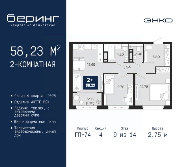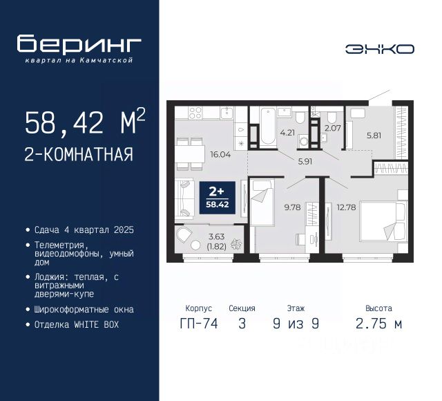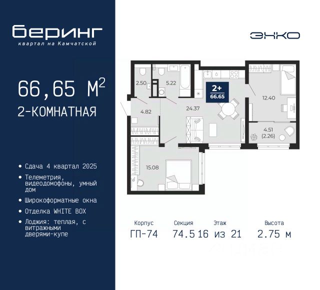 2-комн. квартира от застройщика в ЖК "Беринг" на 7 этаже. Квартира без отделки, после выдачи ключей можно делать ремонт. Общая площадь: 66.65 кв.м., жилая: 27.48 кв.м., площадь просторной кухни-столовой: 24.37 кв.м. Квартира угловая, очень светлая, естественная вентиляция при открытии окон. В квартире одна лоджия, один совмещенный и один раздельный санузел. Высота потолков 2.75 м. Дом монолитный, многоподъездный, переменной этажности, от 9 до 21 этажей. Квартира находится в 74.5-й секции высотой 21 этаж в корпусе ГП-74. На этаже 7 квартир. В подъезде 1 пассажирский и 1 грузовой лифт. Окончание строительства - 4 квартал 2025 года. Оформление сделки по договору долевого участия. Подобно знаменитому исследователю, мы чувствуем себя первооткрывателями этой локации. Хотим показать новую суть места, сформировать для вас жизненный опыт, которого ещё не было. Беринг — район зелёного цвета. Беринг — район, который откроется вам с другой стороны. Впечатлит новым уровнем комфорта и качеством жизни. Беринг — открытие на карте города. Первый квартал расположен в районе Тура, в границах улиц: Камчатская Западносибирская Энтузиастов. Вокруг уже есть всё для того, чтобы ежедневная рутина была лишь частью жизни и не доставляла дискомфорта. Школы и детские сады, магазины и аптеки, поликлиника, места для семейного отдыха, пеших и велопрогулок, и даже рыбалки. Масштабное озеленение дворов — визитная карточка ЭНКО и ваш оазис спокойствия, чтобы отвлечься от повседневности. Раскидистые деревья, кустарники, травы и цветы — осталось остановиться, вдохнуть и расслабиться, глядя на эту природную красоту. Стилистика подъездов продолжает концепцию Беринга, вдохновлённого Камчаткой: сдержанный, но при этом впечатляющий дизайн соседствует с удобством и функциональностью. #23STmC
