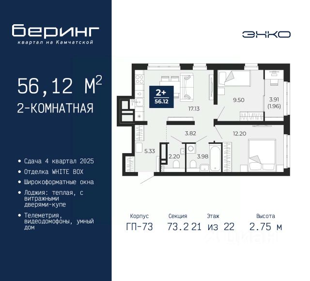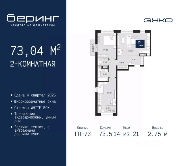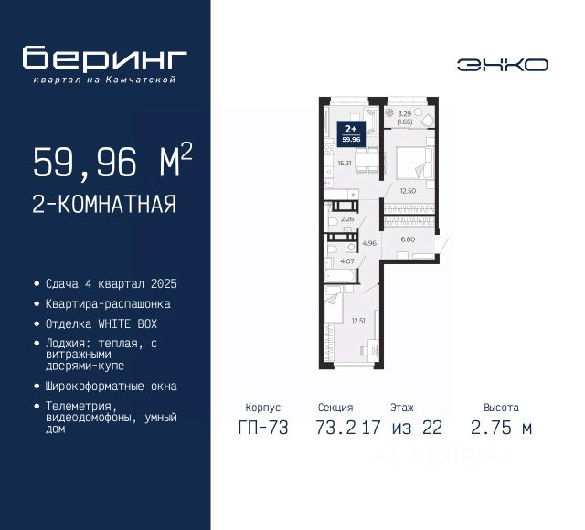 2-комн. квартира от застройщика в ЖК "Беринг" на 7 этаже. Квартира без отделки, после выдачи ключей можно делать ремонт. Общая площадь: 66.65 кв.м., жилая: 27.48 кв.м., площадь просторной кухни-столовой: 24.37 кв.м. Квартира угловая, очень светлая, естественная вентиляция при открытии окон. В квартире одна лоджия, один совмещенный и один раздельный санузел. Высота потолков 2.75 м. Дом монолитный, многоподъездный, переменной этажности, от 9 до 21 этажей. Квартира находится в 74.5-й секции высотой 21 этаж в корпусе ГП-74. На этаже 7 квартир. В подъезде 1 пассажирский и 1 грузовой лифт. Окончание строительства - 4 квартал 2025 года. Оформление сделки по договору долевого участия. Подобно знаменитому исследователю, мы чувствуем себя первооткрывателями этой локации. Хотим показать новую суть места, сформировать для вас жизненный опыт, которого ещё не было. Беринг — район зелёного цвета. Беринг — район, который откроется вам с другой стороны. Впечатлит новым уровнем комфорта и качеством жизни. Беринг — открытие на карте города. Первый квартал расположен в районе Тура, в границах улиц: Камчатская Западносибирская Энтузиастов. Вокруг уже есть всё для того, чтобы ежедневная рутина была лишь частью жизни и не доставляла дискомфорта. Школы и детские сады, магазины и аптеки, поликлиника, места для семейного отдыха, пеших и велопрогулок, и даже рыбалки. Масштабное озеленение дворов — визитная карточка ЭНКО и ваш оазис спокойствия, чтобы отвлечься от повседневности. Раскидистые деревья, кустарники, травы и цветы — осталось остановиться, вдохнуть и расслабиться, глядя на эту природную красоту. Стилистика подъездов продолжает концепцию Беринга, вдохновлённого Камчаткой: сдержанный, но при этом впечатляющий дизайн соседствует с удобством и функциональностью. #23STmC