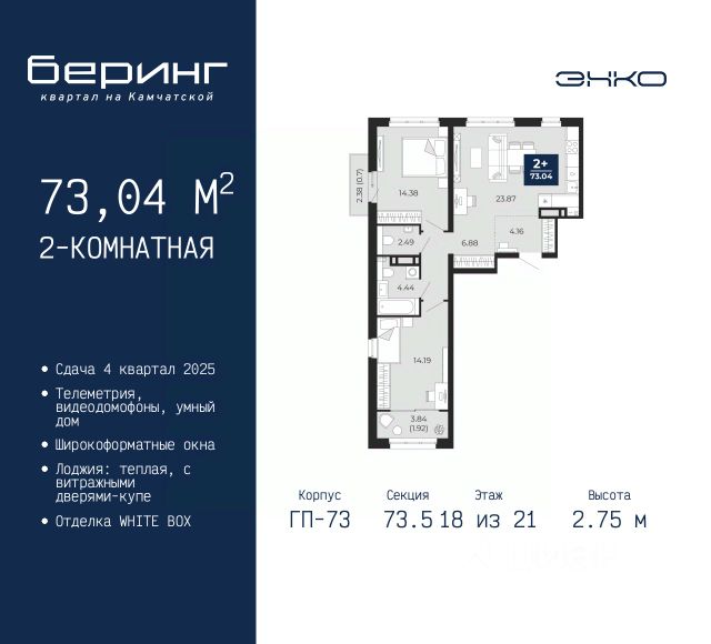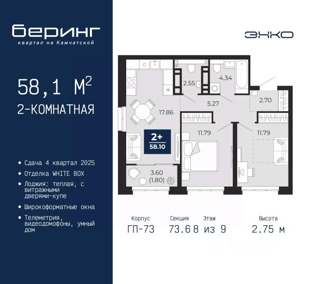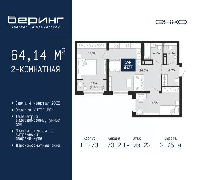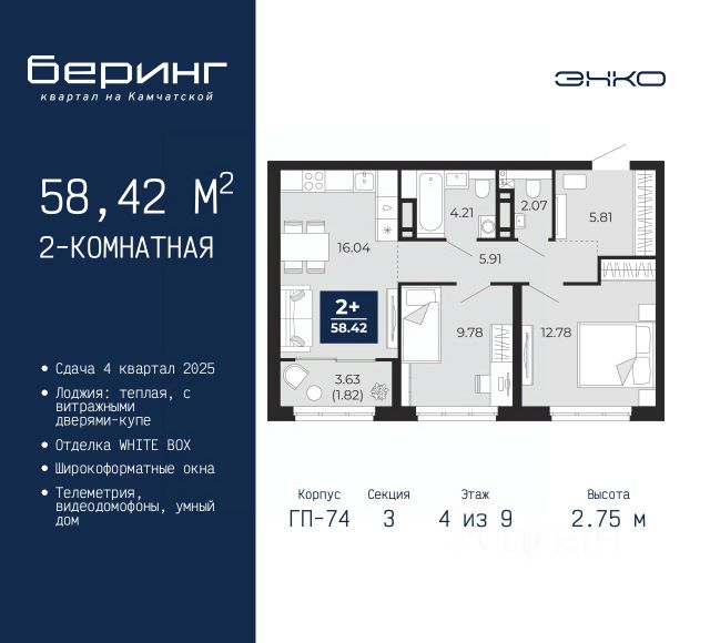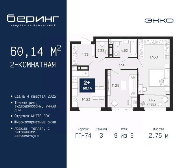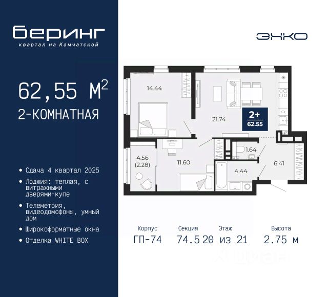 Продается 2-комн. квартира от застройщика в ЖК "Беринг" на 7 этаже. Квартира без отделки, полностью готова к ремонту. Общая площадь: 66.65 кв.м., жилая: 27.48 кв.м., площадь просторной кухни-столовой: 24.37 кв.м. Квартира угловая, идеально подойдет любителям тишины и панорамных видов. В квартире одна лоджия, один совмещенный и один раздельный санузел. Высота потолков 2.75 м. Дом монолитный, многоподъездный, переменной этажности, от 9 до 21 этажей. Квартира находится в 74.5-й секции высотой 21 этаж в корпусе ГП-74. На этаже 7 квартир. В подъезде 1 пассажирский и 1 грузовой лифт. Окончание строительства - 4 квартал 2025 года. Оформление сделки по договору долевого участия. Подобно знаменитому исследователю, мы чувствуем себя первооткрывателями этой локации. Хотим показать новую суть места, сформировать для вас жизненный опыт, которого ещё не было. Беринг — район зелёного цвета. Беринг — район, который откроется вам с другой стороны. Впечатлит новым уровнем комфорта и качеством жизни. Беринг — открытие на карте города. Первый квартал расположен в районе Тура, в границах улиц: Камчатская Западносибирская Энтузиастов. Вокруг уже есть всё для того, чтобы ежедневная рутина была лишь частью жизни и не доставляла дискомфорта. Школы и детские сады, магазины и аптеки, поликлиника, места для семейного отдыха, пеших и велопрогулок, и даже рыбалки. Масштабное озеленение дворов — визитная карточка ЭНКО и ваш оазис спокойствия, чтобы отвлечься от повседневности. Раскидистые деревья, кустарники, травы и цветы — осталось остановиться, вдохнуть и расслабиться, глядя на эту природную красоту. Стилистика подъездов продолжает концепцию Беринга, вдохновлённого Камчаткой: сдержанный, но при этом впечатляющий дизайн соседствует с удобством и функциональностью. #ZU576C