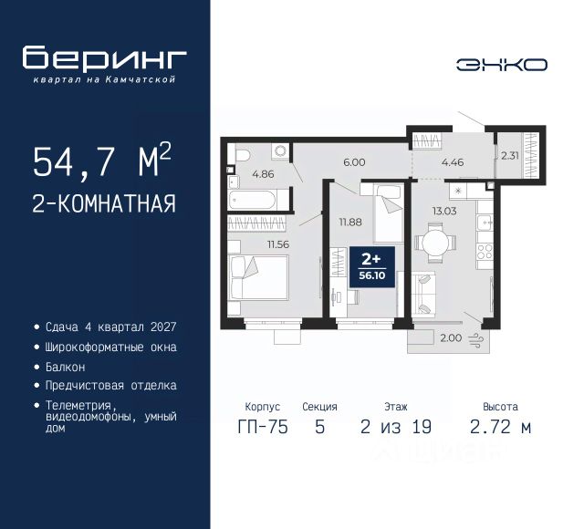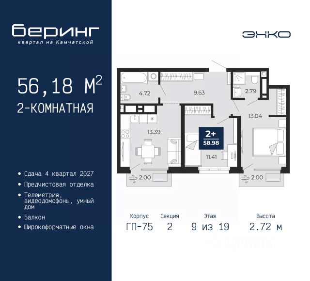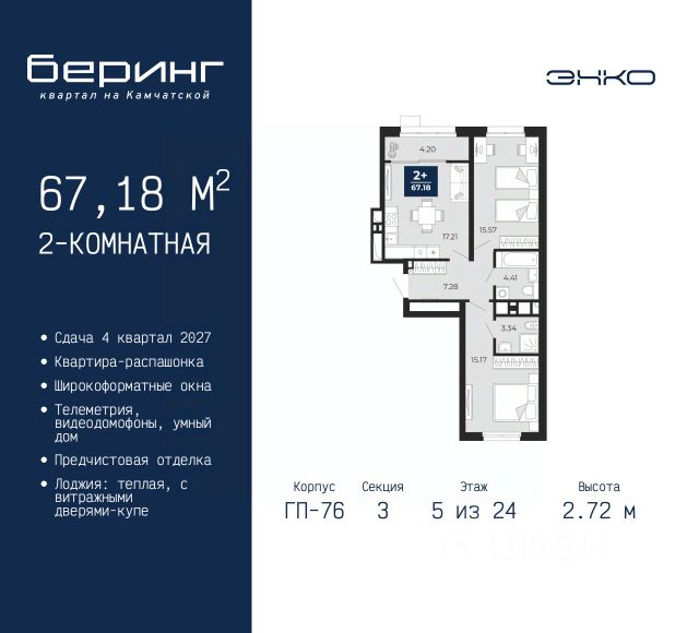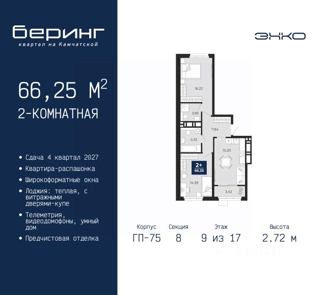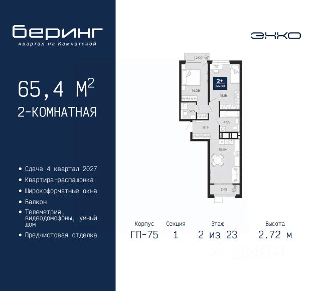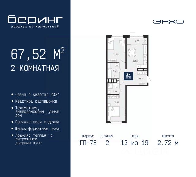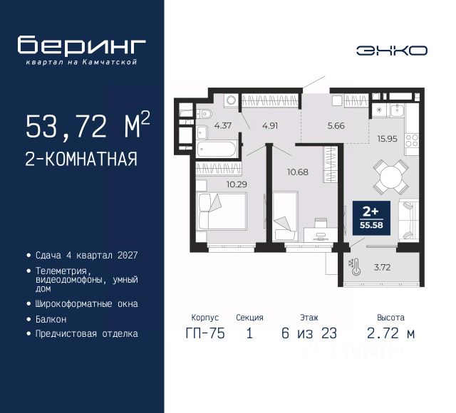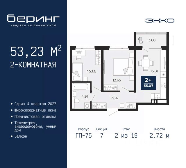 Двухкомнатная квартира от застройщика с предчистовой отделкой в ЖК "Беринг" на 10 этаже. Общая площадь: 50.42 кв.м., жилая: 22.6 кв.м., площадь просторной кухни-столовой: 15.11 кв.м. Комнаты изолированные, все окна выходят на одну сторону. В квартире один балкон, один совмещенный санузел. Высота потолков 2.72 м. Дом монолитный, черырехподъездный, переменной этажности, от 19 до 24 этажей. Квартира находится во 2-й секции высотой 19 этажей в корпусе ГП-76. На этаже 8 квартир. В подъезде 1 пассажирский и 1 грузовой лифт. Окончание строительства - 4 квартал 2027 года. Оформление сделки по договору долевого участия. Подобно знаменитому исследователю, мы чувствуем себя первооткрывателями этой локации. Хотим показать новую суть места, сформировать для вас жизненный опыт, которого ещё не было. Беринг — район зелёного цвета. Беринг — район, который откроется вам с другой стороны. Впечатлит новым уровнем комфорта и качеством жизни. Беринг — открытие на карте города. Первый квартал расположен в районе Тура, в границах улиц: Камчатская Западносибирская Энтузиастов. Вокруг уже есть всё для того, чтобы ежедневная рутина была лишь частью жизни и не доставляла дискомфорта. Школы и детские сады, магазины и аптеки, поликлиника, места для семейного отдыха, пеших и велопрогулок, и даже рыбалки. Масштабное озеленение дворов — визитная карточка ЭНКО и ваш оазис спокойствия, чтобы отвлечься от повседневности. Раскидистые деревья, кустарники, травы и цветы — осталось остановиться, вдохнуть и расслабиться, глядя на эту природную красоту. Стилистика подъездов продолжает концепцию Беринга, вдохновлённого Камчаткой: сдержанный, но при этом впечатляющий дизайн соседствует с удобством и функциональностью. #2MmCmv