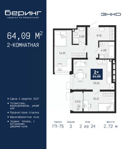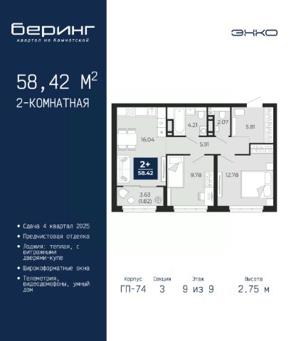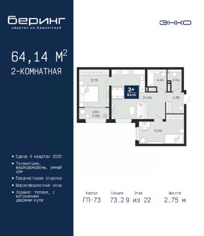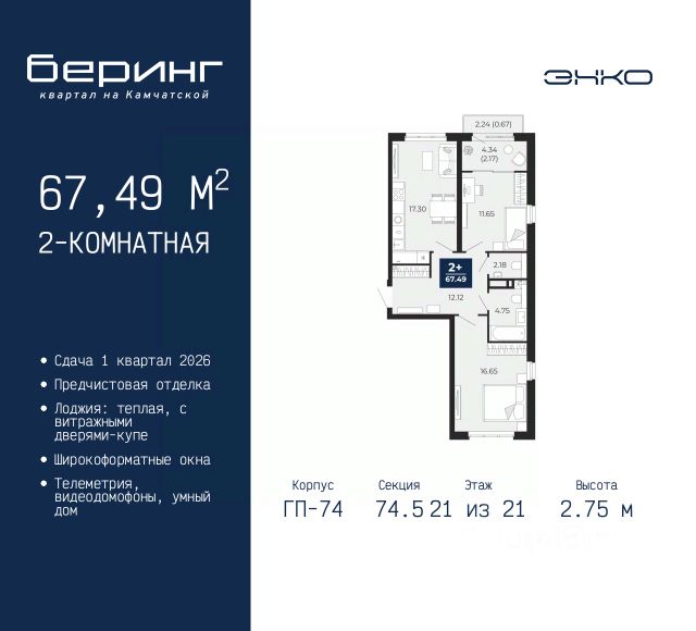 Просторная 2-комн. квартира с предчистовой отделкой в ЖК "Беринг" на 9 этаже. Общая площадь: 53.72 кв.м., жилая: 20.97 кв.м., площадь просторной кухни-столовой: 15.95 кв.м. Комнаты изолированные, все окна выходят на одну сторону. В квартире один балкон, один совмещенный санузел. Высота потолков 2.72 м. Дом монолитный, многоподъездный, переменной этажности, от 17 до 24 этажей. Квартира находится в 1-й секции высотой 23 этажа в корпусе ГП-75. На этаже 8 квартир. В подъезде 2 пассажирских и 1 грузовой лифт. Окончание строительства - 4 квартал 2027 года. Оформление сделки по договору долевого участия. Подобно знаменитому исследователю, мы чувствуем себя первооткрывателями этой локации. Хотим показать новую суть места, сформировать для вас жизненный опыт, которого ещё не было. Беринг — район зелёного цвета. Беринг — район, который откроется вам с другой стороны. Впечатлит новым уровнем комфорта и качеством жизни. Беринг — открытие на карте города. Первый квартал расположен в районе Тура, в границах улиц: Камчатская Западносибирская Энтузиастов. Вокруг уже есть всё для того, чтобы ежедневная рутина была лишь частью жизни и не доставляла дискомфорта. Школы и детские сады, магазины и аптеки, поликлиника, места для семейного отдыха, пеших и велопрогулок, и даже рыбалки. Масштабное озеленение дворов — визитная карточка ЭНКО и ваш оазис спокойствия, чтобы отвлечься от повседневности. Раскидистые деревья, кустарники, травы и цветы — осталось остановиться, вдохнуть и расслабиться, глядя на эту природную красоту. Стилистика подъездов продолжает концепцию Беринга, вдохновлённого Камчаткой: сдержанный, но при этом впечатляющий дизайн соседствует с удобством и функциональностью. #ZM997F