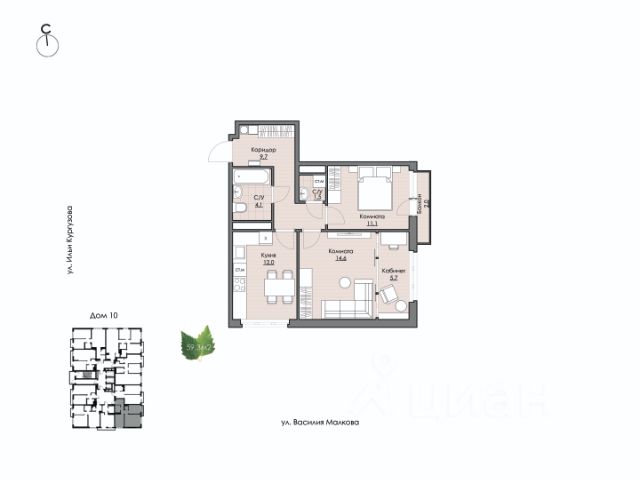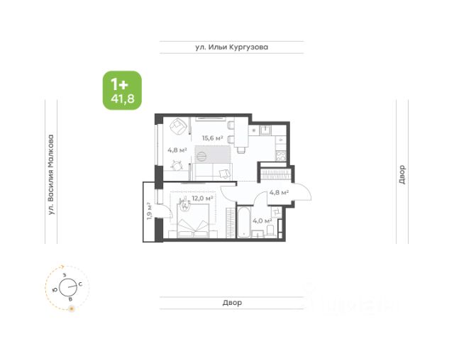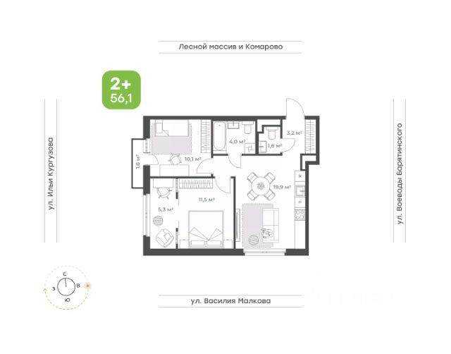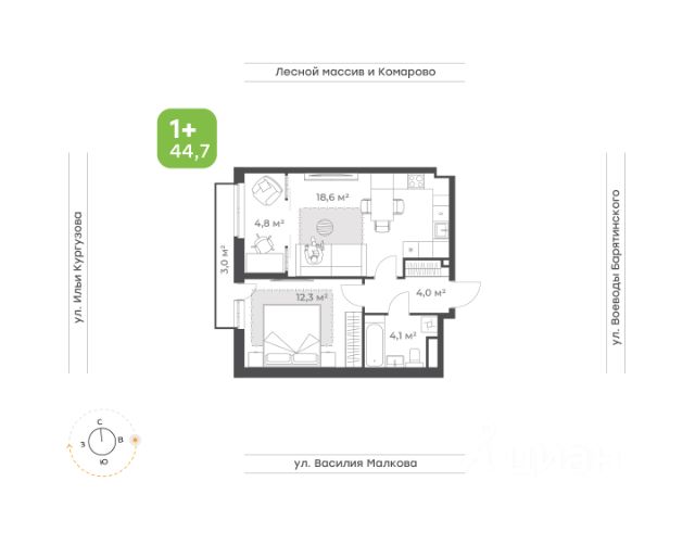 Квартира 1+ с видом на современный микрорайон Комарово-парк Если вы выбрали эту квартиру, то вы счастливый обладатель идеальной квартиры евроформата! • Спальня с выходом на французский балкон • Вместительный коридор с нишей под шкаф-купе • Удобный санузел, где вместится все необходимое