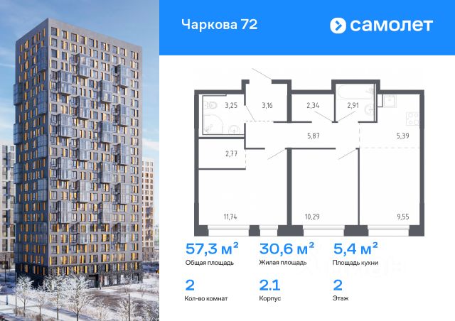 В продаже 2-комнатная квартира в корпусе 2.1 ЖК 'Чаркова 72'. Квартира располагается на 2 этаже, общая площадь 57.27 м2.