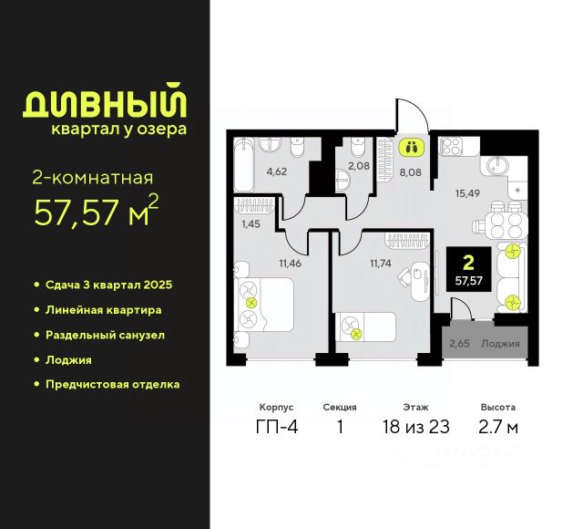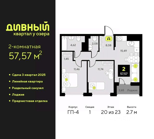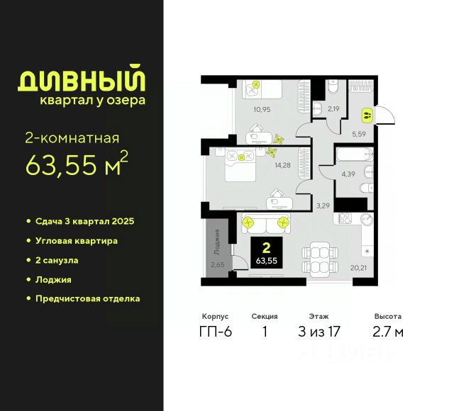 Просторная двухкомнатная квартира с предчистовой отделкой в ЖК "Дивный квартал у озера" на 10 этаже. Общая площадь: 63.55 кв.м., жилая: 25.23 кв.м., площадь просторной кухни-столовой: 20.21 кв.м. Угловая квартира, очень светлая, естественная вентиляция при открытии окон. В квартире одна лоджия, один совмещенный и один раздельный санузел. Высота потолков 2.7 м. Квартира будет сдаваться с предчистовой отделкой White Box: выровнены и оштукатурены стены, проведено электричество и отопление, установлены радиаторы. Вы также можете приобрести квартиру с ремонтом от застройщика, представленным в трех цветовых решениях Scandi, Wood и Coffee и включающим: ламинат, обои под покраску, двери, натяжной потолок, санузел с сантехникой. При желании вы можете заказать отделку под ключ, варианты возможных решений представлены в альбоме фотографий. Дом монолитный, трехподъездный, переменной этажности, от 9 до 17 этажей. Квартира находится в 1-й секции высотой 17 этажей в корпусе ГП-6. На этаже 8 квартир. В подъезде 1 пассажирский и 1 грузовой лифт. Окончание строительства - 4 квартал 2025 года. Оформление сделки по договору долевого участия. "Дивный квартал у озера" современный жилой квартал, удобно расположенный в 10-ти минутах от центра Тюмени, в уютном районе рядом с зеленым массивом и озером Алебашево. Комплекс находится между улицами Мельникайте и Алебашевская, что обеспечивает его хорошую транспортную доступность до центра на автомобиле всего 10 минут. Рядом с комплексом расположен Лесопарк имени Гагарина, экзотический Парк дружбы между Россией и Республикой Корея. "Дивный квартал у озера" объединяет архитектуру современной городской застройки и природную эстетику. Уютные дворы жилого комплекса будут не только безопасными, но и тихими. Закрытая территория надёжно защищена от шума и посторонних глаз. Здесь будут места для отдыха, детские площадки, зоны для выгула собак. В холлах первого этажа расположены мягкая зона ожидания, общественные санузлы и просторная колясочная. Квартал будет располагать богатой инфраструктурой: на первых этажах домов разместятся магазины, пекарни, кофейни, пункты выдачи, аптеки, детские центры, цветочные салоны и многое другое, что сделает жизнь поистине комфортной. В комплексе есть теплый подземный паркинг и кладовые. #24AblB
