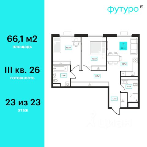 Продаётся 2-комнатная квартира в строящемся доме (Дом 6к1), срок сдачи: III-кв. 2026, общей площадью 66.1 кв.м., на 22 этаже. Новый жилой комплекс "Futuro" от застройщика "newton" расположен в г. Тюмень на Ставропольской улице.