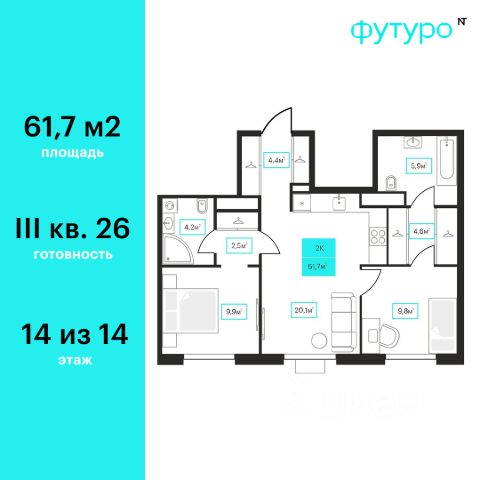 Продаётся 2-комнатная квартира в строящемся доме (Дом 6к2), срок сдачи: III-кв. 2026, общей площадью 61.7 кв.м., на 14 этаже. Новый жилой комплекс "Futuro" от застройщика "newton" расположен в г. Тюмень на Ставропольской улице.