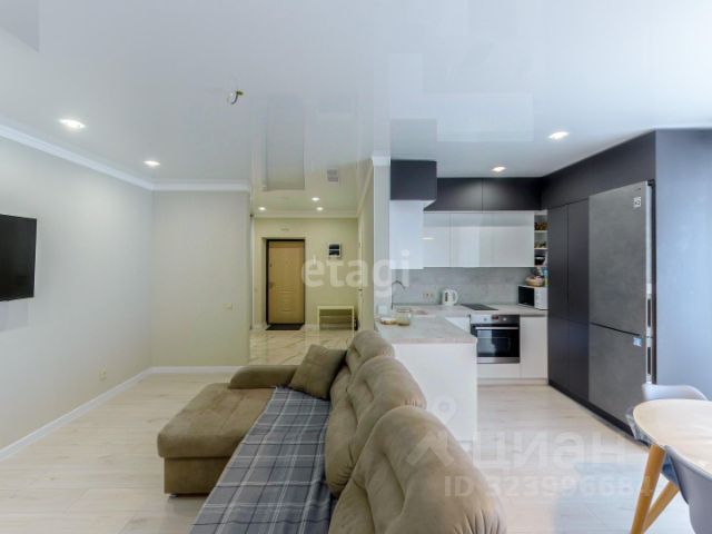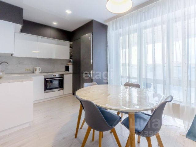 Панорамный балкон, шикарный вид на город. Остается всё что на фото: кухонная мебель, встроенная бытовая техника, холодильник Samsung, свч Samsung, телевизор LG на кронштейне, стиральная машина LG, шторы на карнизах.