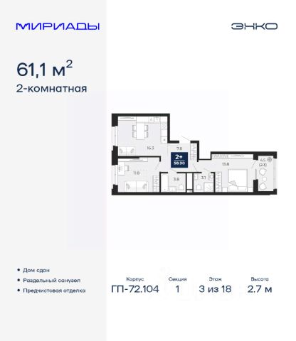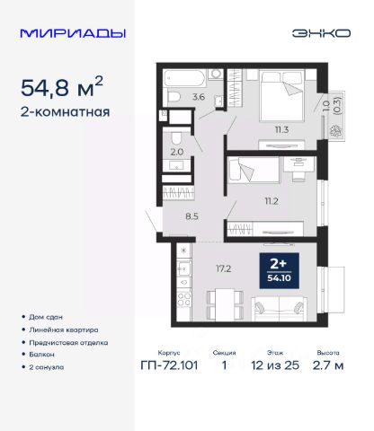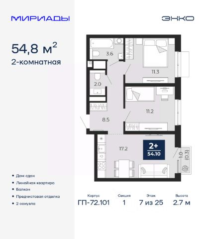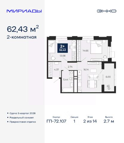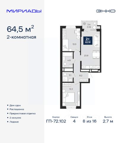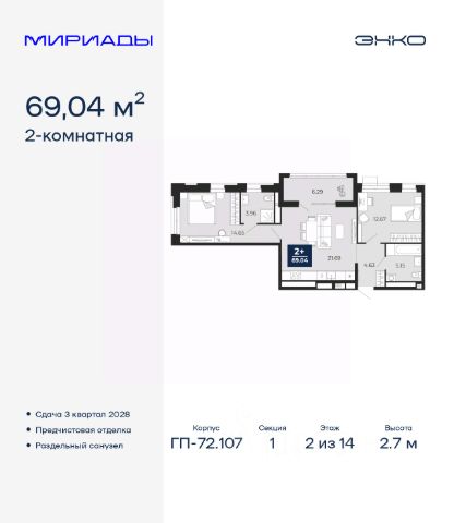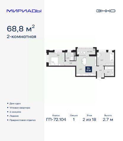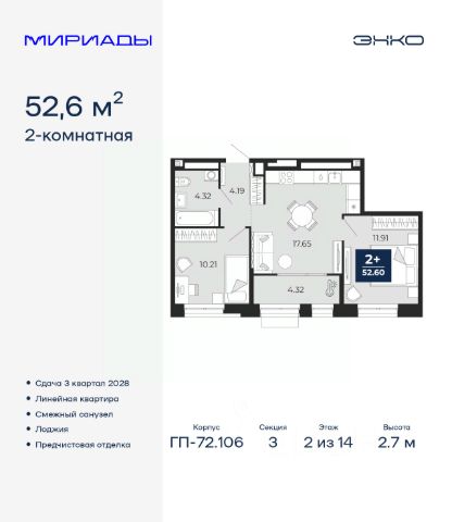 2-комн. квартира с европланировкой и предчистовой отделкой в ЖК "Мириады" на 8 этаже. Общая площадь: 40.12 кв.м., жилая: 21.05 кв.м., суммарная площадь гостиной-столовой с кухонной зоной: 15.5 кв.м. Европейская планировка, кухня-гостиная - идеальный вариант для тех, кто любит часто принимать гостей. Комнаты изолированные, все окна выходят на одну сторону. В квартире одна лоджия, один совмещенный санузел. Высота потолков 2.7 м. Дом монолитный, двухподъездный, переменной этажности, от 14 до 16 этажей. Квартира находится во 2-й секции высотой 16 этажей в корпусе ГП-72.107. На этаже 10 квартир. В подъезде 1 пассажирский и 1 грузовой лифт. Окончание строительства - 3 квартал 2028 года. Оформление сделки по договору долевого участия. Вселенная бесконечных историй. Ранее невиданный Тюмени масштаб: территория 240 гектаров и 1 650 000 м² застройки. Мириады это город масштабных перемен и больших возможностей. Город зеленых рощ и зеркальных озер. Город для работы, учебы и развлечений. Город для детей и их родителей. Город для всех и каждого. Проект расположен в районе Мыс рядом с ТРЦ "Тюмень Сити Молл" в границах улицы Тимофея Чаркова, Тобольского тракта и объездной дороги. Срок полного освоения территории - до 2034 года. #2Mdgdv