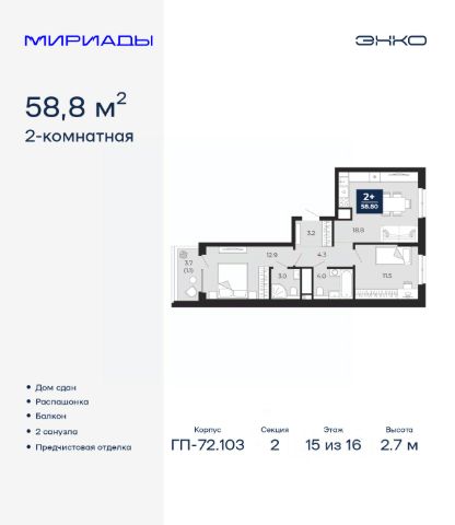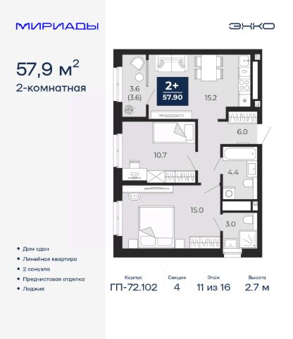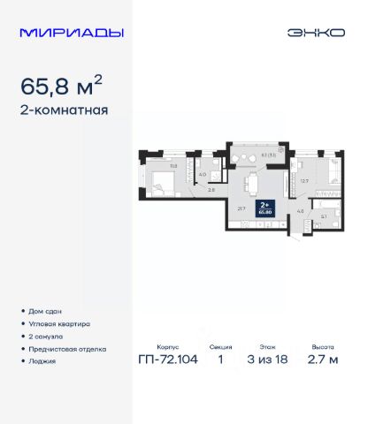 Двухкомнатная квартира с европланировкой и предчистовой отделкой в ЖК "Мириады" на 1 этаже. Общая площадь: 40.7 кв.м., жилая: 20.7 кв.м., суммарная площадь гостиной-столовой с кухонной зоной: 15.4 кв.м. Европейская планировка, кухня-гостиная - идеальный вариант для тех, кто любит часто принимать гостей. Комнаты изолированные, все окна выходят на одну сторону. В квартире одна лоджия, один совмещенный санузел. Высота потолков 2.7 м. Дом монолитный, двухподъездный, переменной этажности, от 14 до 18 этажей. Квартира находится во 2-й секции высотой 14 этажей в корпусе ГП-72.104. На этаже 8 квартир. В подъезде 1 пассажирский и 1 грузовой лифт. Строительство окончено, дом сдан в 4 квартале 2025 года. Оформление сделки по договору купли-продажи. Вселенная бесконечных историй. Ранее невиданный Тюмени масштаб: территория 240 гектаров и 1 650 000 м² застройки. Мириады это город масштабных перемен и больших возможностей. Город зеленых рощ и зеркальных озер. Город для работы, учебы и развлечений. Город для детей и их родителей. Город для всех и каждого. Проект расположен в районе Мыс рядом с ТРЦ "Тюмень Сити Молл" в границах улицы Тимофея Чаркова, Тобольского тракта и объездной дороги. Срок полного освоения территории - до 2034 года. #Zm7DC8