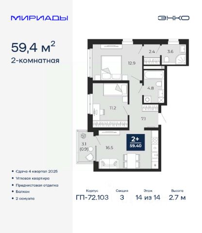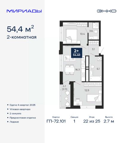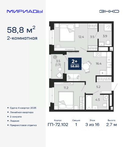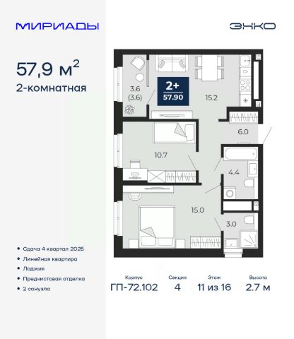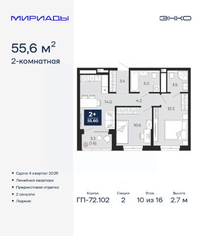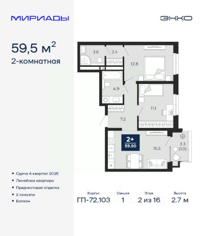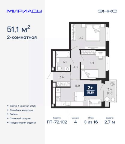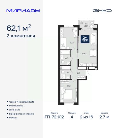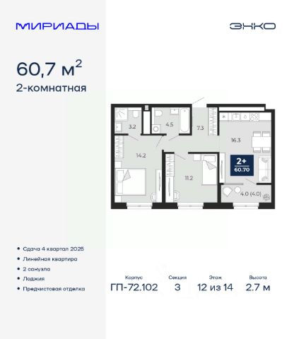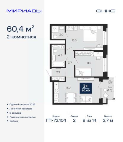 2-комн. квартира с европланировкой и предчистовой отделкой в ЖК "Мириады" на 1 этаже. Общая площадь: 40.7 кв.м., жилая: 20.7 кв.м., общая площадь гостиной-столовой с кухонной зоной: 15.4 кв.м. Европланировка, кухня-гостиная - идеальный вариант для тех, кто любит часто принимать гостей. Комнаты изолированные, все окна выходят на одну сторону. В квартире одна лоджия, один совмещенный санузел. Высота потолков 2.7 м. Дом монолитный, двухподъездный, переменной этажности, от 14 до 18 этажей. Квартира находится во 2-й секции высотой 14 этажей в корпусе ГП-72.104. На этаже 8 квартир. В подъезде 1 пассажирский и 1 грузовой лифт. Окончание строительства - 4 квартал 2025 года. Оформление сделки по договору долевого участия. Вселенная бесконечных историй. Ранее невиданный Тюмени масштаб: территория 240 гектаров и 1 650 000 м² застройки. Мириады это город масштабных перемен и больших возможностей. Город зеленых рощ и зеркальных озер. Город для работы, учебы и развлечений. Город для детей и их родителей. Город для всех и каждого. Проект расположен в районе Мыс рядом с ТРЦ "Тюмень Сити Молл" в границах улицы Тимофея Чаркова, Тобольского тракта и объездной дороги. Срок полного освоения территории - до 2034 года. #2MTDcv