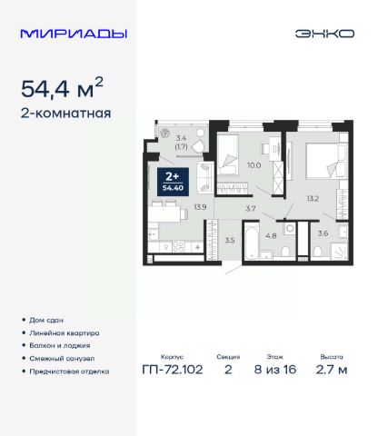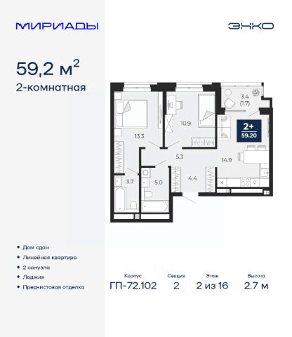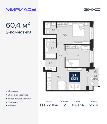 Просторная 2-комн. квартира с европланировкой и предчистовой отделкой в ЖК "Мириады" на 1 этаже. Общая площадь: 40.7 кв.м., жилая: 20.7 кв.м., суммарная площадь гостиной-столовой с кухонной зоной: 15.4 кв.м. Европланировка, кухня-гостиная - идеальный вариант для тех, кто любит часто принимать гостей. Комнаты изолированные, все окна выходят на одну сторону. В квартире одна лоджия, один совмещенный санузел. Высота потолков 2.7 м. Дом монолитный, двухподъездный, переменной этажности, от 14 до 18 этажей. Квартира находится во 2-й секции высотой 14 этажей в корпусе ГП-72.104. На этаже 8 квартир. В подъезде 1 пассажирский и 1 грузовой лифт. В настоящее время строительство завершено, дом сдан в 4 квартале 2025 года. Оформление сделки по договору купли-продажи. Вселенная бесконечных историй. Ранее невиданный Тюмени масштаб: территория 240 гектаров и 1 650 000 м² застройки. Мириады это город масштабных перемен и больших возможностей. Город зеленых рощ и зеркальных озер. Город для работы, учебы и развлечений. Город для детей и их родителей. Город для всех и каждого. Проект расположен в районе Мыс рядом с ТРЦ "Тюмень Сити Молл" в границах улицы Тимофея Чаркова, Тобольского тракта и объездной дороги. Срок полного освоения территории - до 2034 года. #267dC8