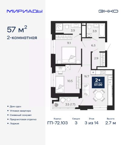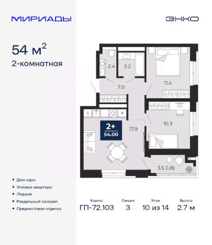 Двухкомнатная квартира с предчистовой отделкой в ЖК "Мириады" на 14 этаже. Общая площадь: 54.1 кв.м., жилая: 22.5 кв.м., площадь просторной кухни-столовой: 17.2 кв.м. Комнаты изолированные, все окна выходят на одну сторону. В квартире одна лоджия, один совмещенный и один раздельный санузел. Высота потолков 2.7 м. Квартира находится в корпусе ГП-72.101. Дом монолитный, одноподъездный, высотой 25 этажей. На этаже 8 квартир. В подъезде 2 пассажирских и 1 грузовой лифт. В настоящее время строительство окончено, дом сдан в 4 квартале 2025 года. Оформление сделки по договору купли-продажи. Вселенная бесконечных историй. Ранее невиданный Тюмени масштаб: территория 240 гектаров и 1 650 000 м² застройки. Мириады это город масштабных перемен и больших возможностей. Город зеленых рощ и зеркальных озер. Город для работы, учебы и развлечений. Город для детей и их родителей. Город для всех и каждого. Проект расположен в районе Мыс рядом с ТРЦ "Тюмень Сити Молл" в границах улицы Тимофея Чаркова, Тобольского тракта и объездной дороги. Срок полного освоения территории - до 2034 года. #267eIA