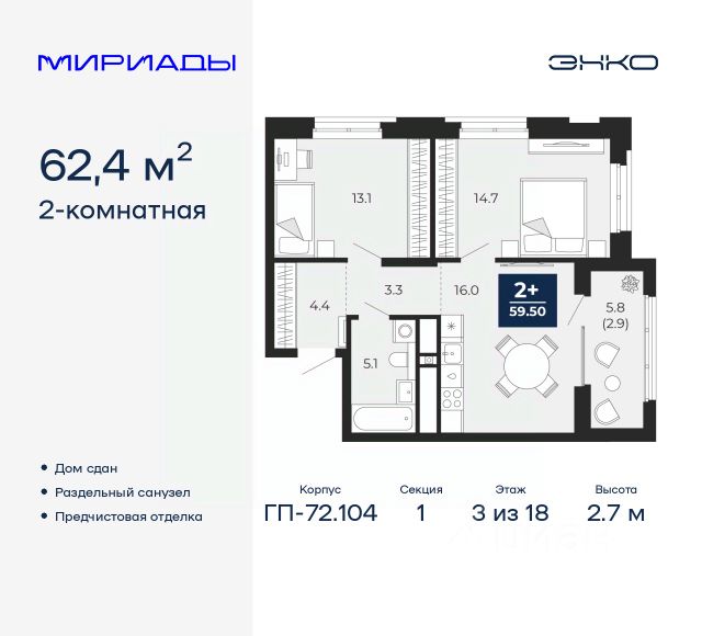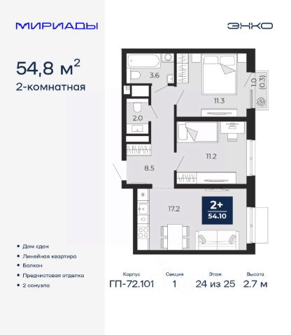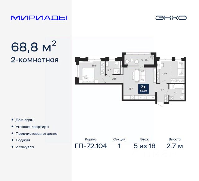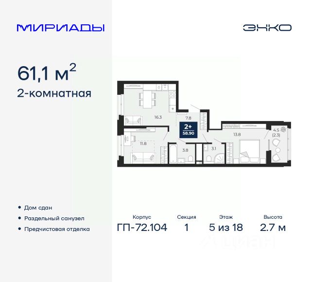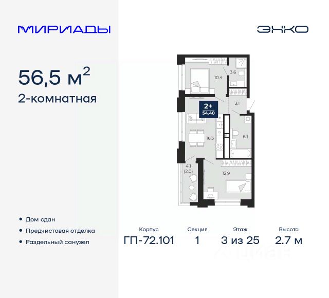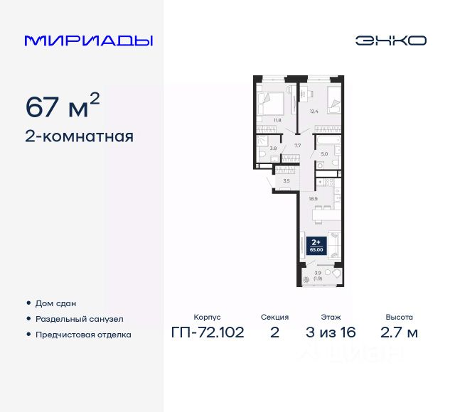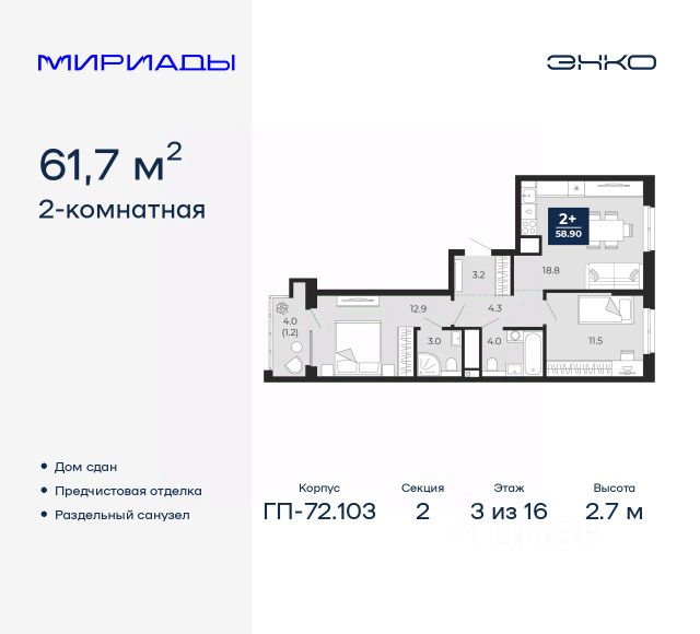 Продается двухкомнатная квартира с европланировкой и предчистовой отделкой в ЖК "Мириады" на 2 этаже. Общая площадь: 40.12 кв.м., жилая: 21.05 кв.м., общая площадь гостиной-столовой с кухонной зоной: 15.5 кв.м. Европланировка, за счет большой площади кухни-гостиной квартира выглядит просторной и очень удобна для жизни. Комнаты изолированные, все окна выходят на одну сторону. В квартире одна лоджия, один совмещенный санузел. Высота потолков 2.7 м. Дом монолитный, двухподъездный, переменной этажности, от 14 до 16 этажей. Квартира находится во 2-й секции высотой 16 этажей в корпусе ГП-72.107. На этаже 10 квартир. В подъезде 1 пассажирский и 1 грузовой лифт. Окончание строительства - 3 квартал 2028 года. Оформление сделки по договору долевого участия. Вселенная бесконечных историй. Ранее невиданный Тюмени масштаб: территория 240 гектаров и 1 650 000 м² застройки. Мириады это город масштабных перемен и больших возможностей. Город зеленых рощ и зеркальных озер. Город для работы, учебы и развлечений. Город для детей и их родителей. Город для всех и каждого. Проект расположен в районе Мыс рядом с ТРЦ "Тюмень Сити Молл" в границах улицы Тимофея Чаркова, Тобольского тракта и объездной дороги. Срок полного освоения территории - до 2034 года. #27022E