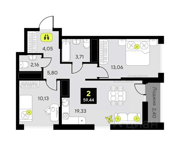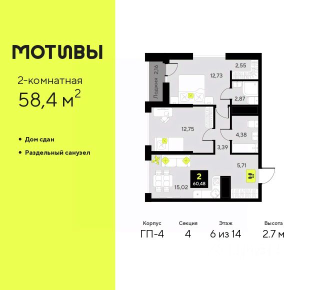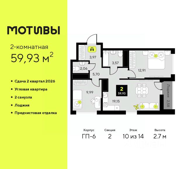 2-комн. квартира с предчистовой отделкой в ЖК "Мотивы" на 4 этаже. Общая площадь: 63.04 кв.м., жилая: 25.77 кв.м., площадь просторной кухни-столовой: 14.94 кв.м. Угловая квартира, очень светлая, естественная вентиляция при открытии окон. В квартире две лоджии, один совмещенный и один раздельный санузел. Высота потолков 2.7 м. Квартира будет сдаваться с предчистовой отделкой White Box: выровнены и оштукатурены стены, проведено электричество и отопление, установлены радиаторы. Вы также можете приобрести квартиру с ремонтом от застройщика, представленным в трех цветовых решениях Scandi, Wood и Coffee и включающим ламинат, обои под покраску, двери, натяжной потолок и санузел с сантехникой. При желании вы можете заказать отделку под ключ, варианты возможных решений представлены в альбоме фотографий. Дом монолитный, черырехподъездный, переменной этажности, от 12 до 14 этажей. Квартира находится в 3-й секции высотой 12 этажей в корпусе ГП-8. На этаже 5 квартир. В подъезде 1 пассажирский и 1 грузовой лифт. Окончание строительства - 2 квартал 2026 года. Оформление сделки по договору долевого участия. Закрытая от автомобилей территория, безопасный двор и камеры видеонаблюдения - гаранты вашего спокойствия. Квартал будет располагать богатой инфраструктурой: на первых этажах разместятся магазины, пекарни, кофейни, пункты выдачи, аптеки, детские центры, цветочные салоны и многое другое, что сделает жизнь поистине комфортной. Рядом находится парк общей площадью почти 5000 м², в котором располагаются локации для игр и отдыха жителей, здесь можно совершить утреннюю пробежку или прогуляться после рабочего дня. В парке есть зона воркаута с тренажерами для взрослых, игровые комплексы с горками и канатный комплекс для детей разных возрастов, качели и лавочки для отдыха, площадки для командных видов спорта и для панна-футбола. В ЖК "Мотивы" всё продумано до мелочей: светлые холлы входных групп, оформленные в едином стиле, просторные колясочные, лапомойки для питомцев. На территории комплекса находятся 2 8-ми этажных паркинга и более 1000 м/м на открытой парковке. Жилой комплекс находится в одном из экологически благоприятных районов Тюмени, недалеко от Плехановского бора. При этом до центра города можно добраться за 15 минут, а до международного аэропорта Рощино за 13 минут. Окончание строительства: ГП 1, 2, 3, 4 сдача до конца 2024 года, ГП 6, 7, 8 сдача 2 квартал 2026 года. #ZWa98F