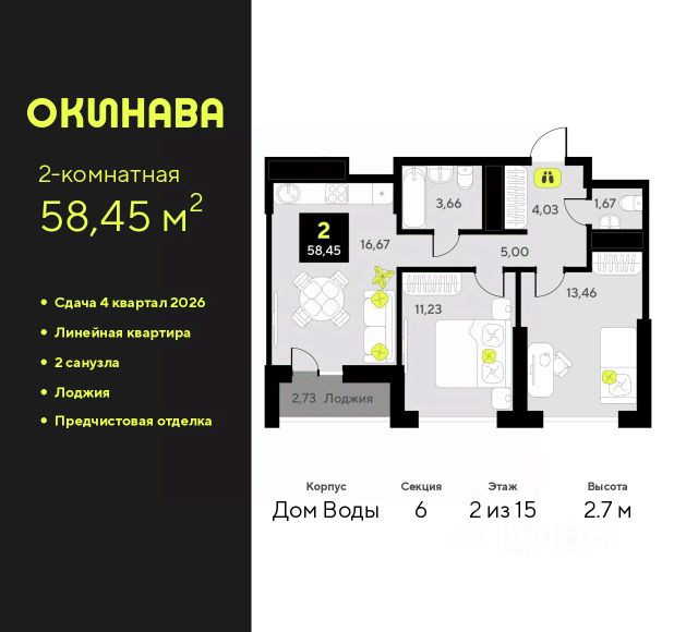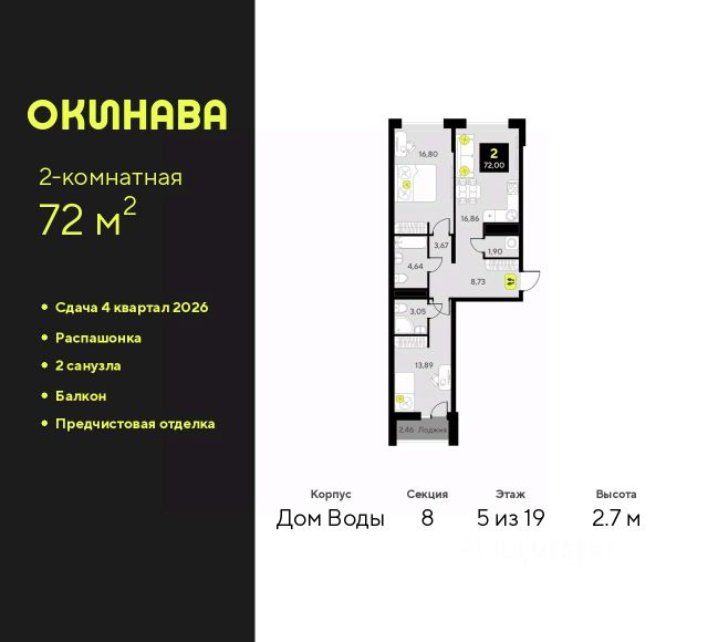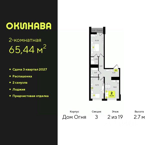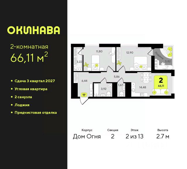 Продается 2-комн. квартира с предчистовой отделкой в ЖК "Окинава" на 2 этаже. Общая площадь: 76.71 кв.м., жилая: 27.53 кв.м., площадь просторной кухни-столовой: 28.47 кв.м. Квартира - распашонка, без проходных комнат, окна выходят на paзные стороны дома. В квартире одна лоджия, один совмещенный и один раздельный санузел. Высота потолков 2.7 м. Квартира будет сдана с предчистовой отделкой: на полах стяжка под финишное покрытие, стены подготовлены под покраску или оклейку обоями, разведена вся электрика с подготовкой для установки выключателей и освещения. При желании вы можете заказать отделку под ключ, варианты возможных решений представлены в альбоме фотографий. Дом монолитный, многоподъездный, переменной этажности, от 11 до 19 этажей. Квартира находится в 3-й секции высотой 13 этажей в корпусе Дом Воды. На этаже 6 квартир. В подъезде 1 пассажирский и 1 грузовой лифт. Окончание строительства - 4 квартал 2026 года. Оформление сделки по договору долевого участия. ЖК "Окинава" это не просто жилой комплекс, это остров 4 стихий. Они отражаются во внешнем виде фасадов домов, обустройстве дворов и внутреннем оформлении холлов. Каждая из стихий это отдельный дом. Между домами раскинется большой двухуровневый пешеходный бульвар. Первый уровень прогулочный с местами для отдыха, амфитеатром и фонтанами. На втором уровне расположатся площадки для детей, спортивных игр и тренировок. Квартал будет располагать богатой инфраструктурой: на первых этажах разместятся магазины, пекарни, кофейни, пункты выдачи, аптеки, детские центры, цветочные салоны и многое другое, что сделает жизнь поистине комфортной. В жилом комплексе есть кладовые, а также несколько видов паркинга: уличный гостевой, закрытый теплый и паркинг в стилобате, попасть в который можно на лифте с любого жилого этажа. Дворы в каждом доме отражают его стихию, отличаясь по наполнению. Они дополняют друг друга, образуя единое дворовое пространство жилого комплекса. Закрытая территория, свободная от автомобилей, обеспечит безопасность и спокойный отдых. Холлы оформлены керамогранитом, зеркалами и разноуровневым освещением. Витражные входные группы, мягкие зоны ожидания, видеонаблюдение 24/7, вместительные колясочные и даже лапомойки для питомцев всё это будет в ЖК "Окинава". Жилой комплекс "Окинава" находится в активно развивающемся V заречном микрорайоне, недалеко от озера Алебашево, где в будущем расположится масштабный ивент-парк с зонами отдыха. Удобная транспортная развязка позволит добраться до центра всего за 15 минут. #Z4aBCs