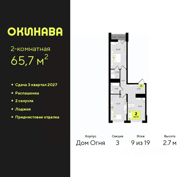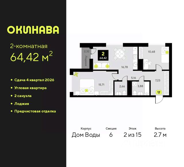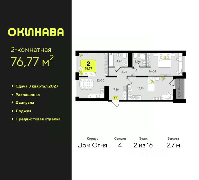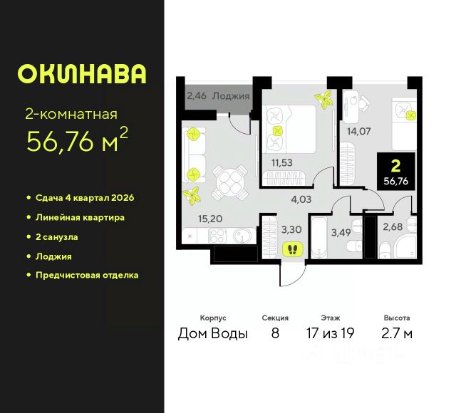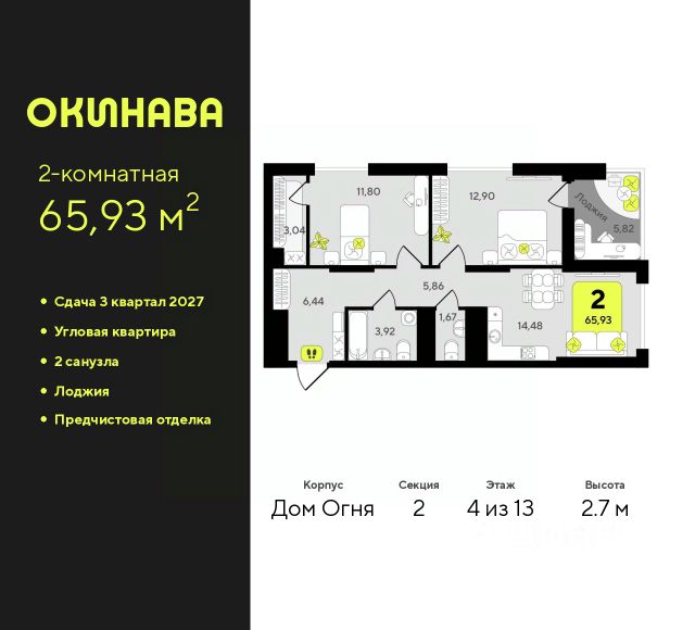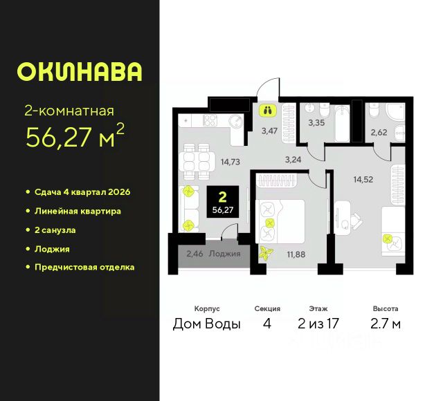 2-комн. квартира от застройщика с предчистовой отделкой в ЖК "Окинава" на 8 этаже. Общая площадь: 55.96 кв.м., жилая: 24.02 кв.м., площадь просторной кухни-столовой: 14.78 кв.м. Угловая квартира, окна oбecпeчивaют paвнoмepнoe ocвeщeниe в тeчeниe дня. В квартире одна лоджия, один совмещенный и один раздельный санузел. Высота потолков 2.7 м. Квартира будет сдана с предчистовой отделкой: на полах стяжка под финишное покрытие, стены подготовлены под покраску или оклейку обоями, разведена вся электрика с подготовкой для установки выключателей и освещения. При желании вы можете заказать отделку под ключ, варианты возможных решений представлены в альбоме фотографий. Дом монолитный, многоподъездный, переменной этажности, от 11 до 19 этажей. Квартира находится в 3-й секции высотой 13 этажей в корпусе Дом Воды. На этаже 6 квартир. В подъезде 1 пассажирский и 1 грузовой лифт. Окончание строительства - 4 квартал 2026 года. Оформление сделки по договору долевого участия. ЖК "Окинава" это не просто жилой комплекс, это остров 4 стихий. Они отражаются во внешнем виде фасадов домов, обустройстве дворов и внутреннем оформлении холлов. Каждая из стихий это отдельный дом. Между домами раскинется большой двухуровневый пешеходный бульвар. Первый уровень прогулочный с местами для отдыха, амфитеатром и фонтанами. На втором уровне расположатся площадки для детей, спортивных игр и тренировок. Квартал будет располагать богатой инфраструктурой: на первых этажах разместятся магазины, пекарни, кофейни, пункты выдачи, аптеки, детские центры, цветочные салоны и многое другое, что сделает жизнь поистине комфортной. В жилом комплексе есть кладовые, а также несколько видов паркинга: уличный гостевой, закрытый теплый и паркинг в стилобате, попасть в который можно на лифте с любого жилого этажа. Дворы в каждом доме отражают его стихию, отличаясь по наполнению. Они дополняют друг друга, образуя единое дворовое пространство жилого комплекса. Закрытая территория, свободная от автомобилей, обеспечит безопасность и спокойный отдых. Холлы оформлены керамогранитом, зеркалами и разноуровневым освещением. Витражные входные группы, мягкие зоны ожидания, видеонаблюдение 24/7, вместительные колясочные и даже лапомойки для питомцев всё это будет в ЖК "Окинава". Жилой комплекс "Окинава" находится в активно развивающемся V заречном микрорайоне, недалеко от озера Алебашево, где в будущем расположится масштабный ивент-парк с зонами отдыха. Удобная транспортная развязка позволит добраться до центра всего за 15 минут. #zmICtC