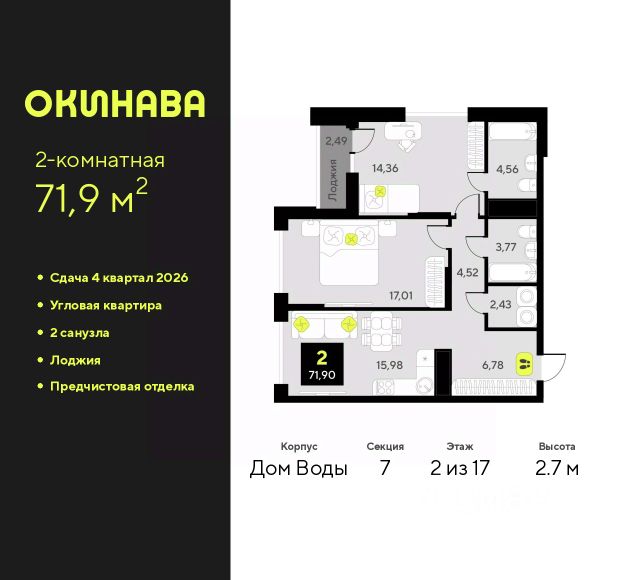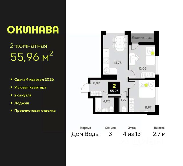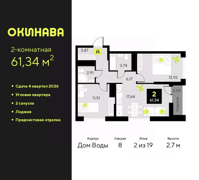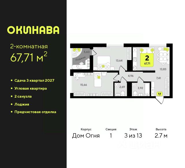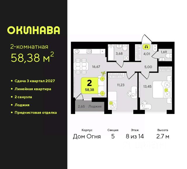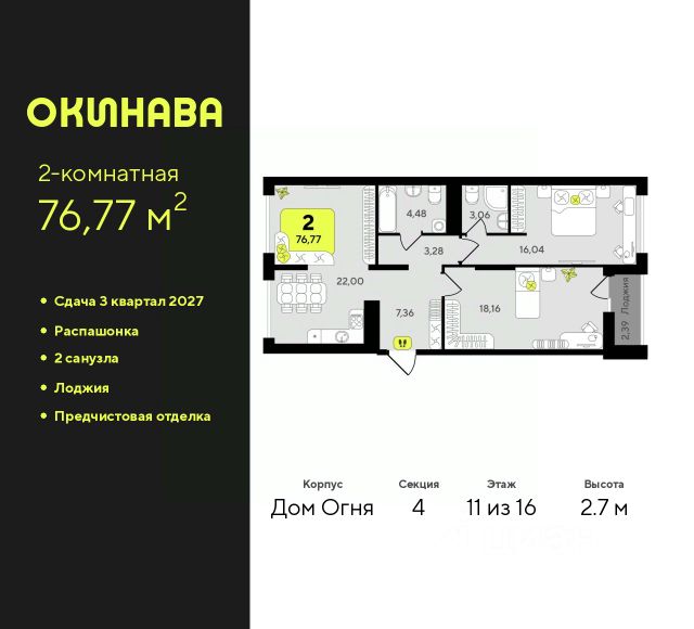 Продается 2-комн. квартира с предчистовой отделкой в ЖК "Окинава" на 2 этаже. Общая площадь: 76.71 кв.м., жилая: 27.53 кв.м., площадь просторной кухни-столовой: 28.47 кв.м. Квартира - распашонка, без проходных комнат, окна выходят на paзные стороны дома. В квартире одна лоджия, один совмещенный и один раздельный санузел. Высота потолков 2.7 м. Квартира будет сдана с предчистовой отделкой: на полах стяжка под финишное покрытие, стены подготовлены под покраску или оклейку обоями, разведена вся электрика с подготовкой для установки выключателей и освещения. При желании вы можете заказать отделку под ключ, варианты возможных решений представлены в альбоме фотографий. Дом монолитный, многоподъездный, переменной этажности, от 11 до 19 этажей. Квартира находится в 3-й секции высотой 13 этажей в корпусе Дом Воды. На этаже 6 квартир. В подъезде 1 пассажирский и 1 грузовой лифт. Окончание строительства - 4 квартал 2026 года. Оформление сделки по договору долевого участия. ЖК "Окинава" это не просто жилой комплекс, это остров 4 стихий. Они отражаются во внешнем виде фасадов домов, обустройстве дворов и внутреннем оформлении холлов. Каждая из стихий это отдельный дом. Между домами раскинется большой двухуровневый пешеходный бульвар. Первый уровень прогулочный с местами для отдыха, амфитеатром и фонтанами. На втором уровне расположатся площадки для детей, спортивных игр и тренировок. Квартал будет располагать богатой инфраструктурой: на первых этажах разместятся магазины, пекарни, кофейни, пункты выдачи, аптеки, детские центры, цветочные салоны и многое другое, что сделает жизнь поистине комфортной. В жилом комплексе есть кладовые, а также несколько видов паркинга: уличный гостевой, закрытый теплый и паркинг в стилобате, попасть в который можно на лифте с любого жилого этажа. Дворы в каждом доме отражают его стихию, отличаясь по наполнению. Они дополняют друг друга, образуя единое дворовое пространство жилого комплекса. Закрытая территория, свободная от автомобилей, обеспечит безопасность и спокойный отдых. Холлы оформлены керамогранитом, зеркалами и разноуровневым освещением. Витражные входные группы, мягкие зоны ожидания, видеонаблюдение 24/7, вместительные колясочные и даже лапомойки для питомцев всё это будет в ЖК "Окинава". Жилой комплекс "Окинава" находится в активно развивающемся V заречном микрорайоне, недалеко от озера Алебашево, где в будущем расположится масштабный ивент-парк с зонами отдыха. Удобная транспортная развязка позволит добраться до центра всего за 15 минут. #Z4aBCs