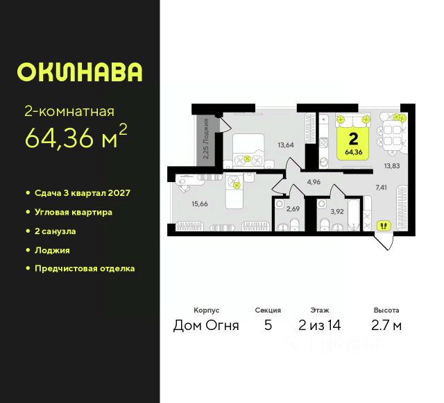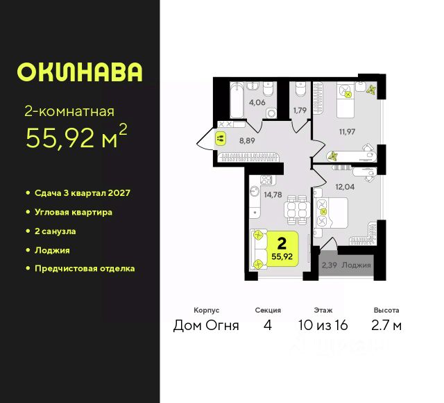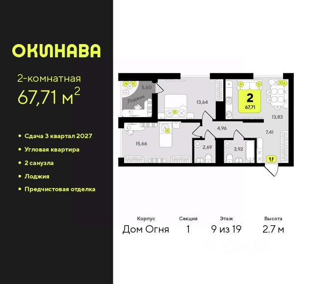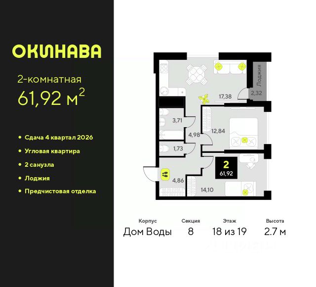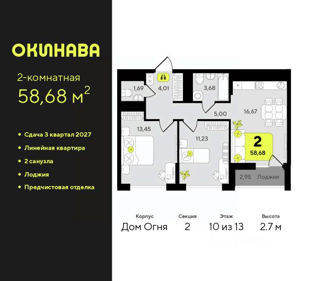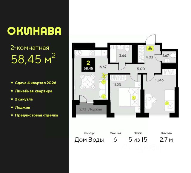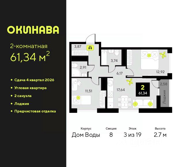 Продается 2-комн. квартира от застройщика с предчистовой отделкой в ЖК "Окинава" на 11 этаже. Общая площадь: 59.65 кв.м., жилая: 26.4 кв.м., площадь просторной кухни-столовой: 16.21 кв.м. Комнаты изолированные, все окна выходят на одну сторону. В квартире один балкон и одна лоджия, два совмещенных санузла. Высота потолков 2.7 м. Квартира будет сдана с предчистовой отделкой: на полах стяжка под финишное покрытие, стены подготовлены под покраску или оклейку обоями, разведена вся электрика с подготовкой для установки выключателей и освещения. При желании вы можете заказать отделку под ключ, варианты возможных решений представлены в альбоме фотографий. Дом монолитный, многоподъездный, переменной этажности, от 11 до 19 этажей. Квартира находится во 2-й секции высотой 11 этажей в корпусе Дом Воды. На этаже 4 квартиры. В подъезде 1 пассажирский и 1 грузовой лифт. Окончание строительства - 4 квартал 2026 года. Оформление сделки по договору долевого участия. ЖК "Окинава" это не просто жилой комплекс, это остров 4 стихий. Они отражаются во внешнем виде фасадов домов, обустройстве дворов и внутреннем оформлении холлов. Каждая из стихий это отдельный дом. Между домами раскинется большой двухуровневый пешеходный бульвар. Первый уровень прогулочный с местами для отдыха, амфитеатром и фонтанами. На втором уровне расположатся площадки для детей, спортивных игр и тренировок. Квартал будет располагать богатой инфраструктурой: на первых этажах разместятся магазины, пекарни, кофейни, пункты выдачи, аптеки, детские центры, цветочные салоны и многое другое, что сделает жизнь поистине комфортной. В жилом комплексе есть кладовые, а также несколько видов паркинга: уличный гостевой, закрытый теплый и паркинг в стилобате, попасть в который можно на лифте с любого жилого этажа. Дворы в каждом доме отражают его стихию, отличаясь по наполнению. Они дополняют друг друга, образуя единое дворовое пространство жилого комплекса. Закрытая территория, свободная от автомобилей, обеспечит безопасность и спокойный отдых. Холлы оформлены керамогранитом, зеркалами и разноуровневым освещением. Витражные входные группы, мягкие зоны ожидания, видеонаблюдение 24/7, вместительные колясочные и даже лапомойки для питомцев всё это будет в ЖК "Окинава". Жилой комплекс "Окинава" находится в активно развивающемся V заречном микрорайоне, недалеко от озера Алебашево, где в будущем расположится масштабный ивент-парк с зонами отдыха. Удобная транспортная развязка позволит добраться до центра всего за 15 минут. #zwAAgZ