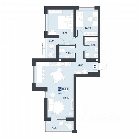 Продаётся 2-комнатная квартира в строящемся доме (ГП-1), срок сдачи: I-кв. 2027, общей площадью 73.69 кв.м., на 2 этаже. Новый жилой комплекс от Специализированного застройщика "Звезда" расположен в г. Тюмень по ул. Рылеева.