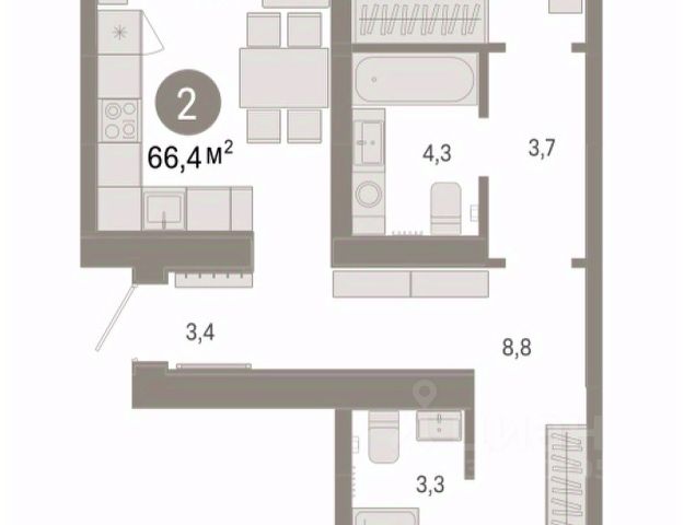 Квартира в счёт первоначального взноса по программе обмена. Звоните, наши менеджеры вам все расскажут! Просторная двухкомнатная квартира с предчистовой отделкой в ЖК "Республики 205" на 3 этаже. Общая площадь: 64.45 кв.м., жилая: 19.1 кв.м., площадь просторной кухни-гостиной: 25.1 кв.м. Квартира - распашонка, без проходных комнат, окна выходят на paзные стороны дома. В квартире два совмещенных санузла. Высота потолков 2.7 м. Купить квартиру можно с помощью программ покупки от застройщика Брусника: - ипотека по эксклюзивной ставке с помощью в получении положительного кредитного решения через сервис ипотечный брокер; - квартиры в рассрочку без процентов от застройщика Брусника; - обмен квартиры на новую. Получить одобрение ипотеки или рассрочку, а также осуществить обмен квартир можно онлайн. Дом монолитный, многоподъездный, переменной этажности, от 7 до 16 этажей. Квартира находится во 2-й секции высотой 8 этажей в корпусе 2. На этаже 4 квартиры. В подъезде 1 грузовой лифт. Начало строительства - 1 квартал 2024 года. Окончание строительства - 1 квартал 2026 года. Оформление сделки по договору долевого участия. Район Проект расположен в границах улиц Пермякова, Энергетиков, Воровского и Республики. До центра города — 10 минут на машине. Рядом — автомобильная развязка на пересечении улиц Пермякова и Республики. В шаговой доступности есть школы, детские сады, поликлиники, крупный торговый центр, автовокзал и несколько скверов. Проект "Республики 205" — это проект комплексного развития территории, уникальный по своему наполнению. Переосмысляя бывшую территорию завода медицинского оборудования, мы создадим новое место силы — микрорайон, насыщенный деловой, развлекательной, рекреационной, игровой, образовательной и медицинской инфраструктурой. До каждого полезного сервиса здесь можно будет дойти за 15 минут. Локальными центрами "Республики 205" будут общественные пространства — скверы, парки, бульвары и площади. В границах нашего участка мы намерены разместить школу, рассчитанную на 1550 учеников, два детских сада на 300 мест и встроенный детский сад на 100 мест. В одном из цехов бывшего завода расположится креативный кластер "Кузница". Он станет площадкой для нескольких институций — галереи, лектория, книжного магазина-библиотеки, кинобара и точек креативного pop-up-ритейла. Пешеходные бульвары внутри района соединят между собой улицу ресторанов, детские и спортивные площадки, событийную площадь и летний кинотеатр. Идентификатор квартиры по базе застройщика: РСП-02-2-2. #25SWCE