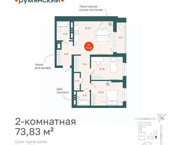 две изолированные комнаты правильной формы (13 кв.м. и 13,3 кв.м.) обеспечат личное пространство для каждого члена семьи. Одна из комнат имеет выход на лоджию.