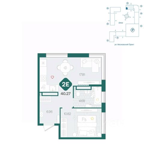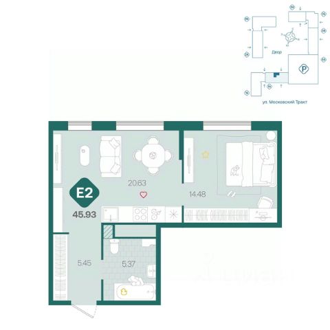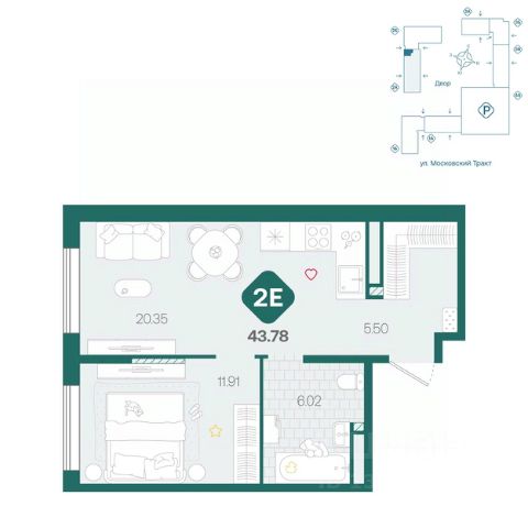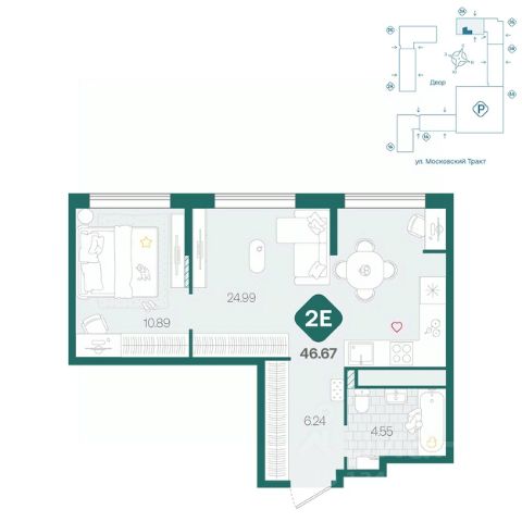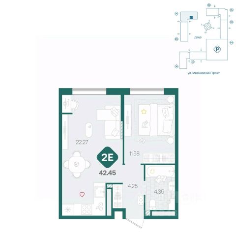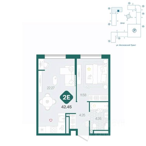 Двухкомнатная квартира форматас отдельной спальней. В большой кухне-гостиной предусмотрена ниша для приготовления еды, столовая зона и гостевая. В прихожей есть ниша для шкафа.