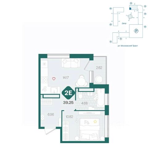 Двухкомнатная квартира с большой кухней более 25м², отдельной спальней с нишей для хранения и просторным санузлом. При входе удобная прихожая с нишей для вместительного шкафа.