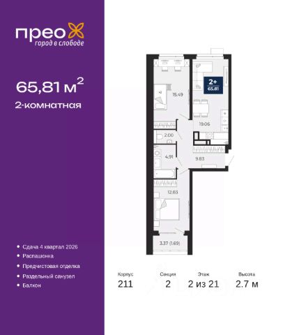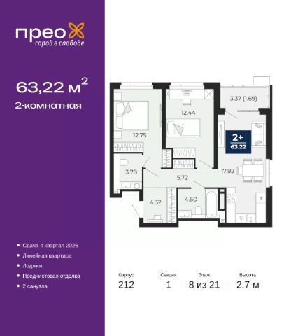 Просторная 2-комн. квартира с предчистовой отделкой в ЖК "Прео" на 10 этаже. Общая площадь: 56.08 кв.м., жилая: 22.33 кв.м., площадь просторной кухни-столовой: 16.04 кв.м. Комнаты изолированные, все окна выходят на одну сторону. В квартире один раздельный санузел. Высота потолков 2.7 м. Дом монолитный, черырехподъездный, переменной этажности, от 14 до 21 этажей. Квартира находится во 2-й секции высотой 21 этаж в корпусе 211. На этаже 10 квартир. В подъезде 1 пассажирский и 1 грузовой лифт. Окончание строительства - 4 квартал 2026 года. Оформление сделки по договору долевого участия. Преображенский — один из самых привлекательных районов для жизни! Это полностью самостоятельный жилой район с точки зрения инфраструктуры. Преображенский находится между Московским и Червишевским трактами в квартале улиц Закалужская — Вьюжная — Александра Протозанова. Не нужно ждать, когда появится инфраструктура — переезжайте на всё готовое. Вблизи расположены действующие школа и детский сад. В этом году откроется еще один сад, а в следующем году — школа. По соседству с Преображенским запланировано строительство городского парка "Комарово" площадью 38 гектар. За 10 минут можно доехать на автомобиле до крупных ТРЦ: "Лента", "Кристалл", "Леруа Мерлен", "Метро" и "Ашан". С 2018 года в районе открыт Соседский центр — пространство, созданное для формирования добрососедской среды, совместного досуга, общения и реализации соседских инициатив. Здесь проходят встречи соседей, а также сами жители района организовывают мероприятия. Организатором такого события может стать любой желающий. В квартирах выполнена качественная предчистовая отделка. Гладкие стены с финишным выравниванием по маякам. Ровный потолок для установки натяжного потолка. Установлены пятикамерные окна с двойным стеклопакетом (3 стекла). Дизайнерские холлы с видеонаблюдением, безбарьерным и прозрачным входом всегда светло и спокойно. На первом этаже есть просторные колясочные, где все жители могут оставлять свои коляски и велосипеды. В Преображенском есть всё, что нужно для активного отдыха и занятий спортом. Мы сделали большое футбольное поле с безопасным покрытием. Также установили хоккейный корт, который оборудован по всем необходимым стандартам. Во дворах можно делать упражнения на специальных площадках с турниками. Весь район мы обустроили велодорожками, которые связаны в единый маршрут. У нас есть сухие фонтаны, бьющие из земли, деревья, веревки, сетки, скалодром, газон, песок и резинка — осталось просто дать своему ребенку право на свободную игру. По-настоящему хорошие дворы — это те, которые дети предпочитают соцсетям и телевизору. Аккредитация в банках: ОАО "Альфа-Банк", ПАО "Банк Уралсиб", ПАО Банк "ВТБ", ПАО "Газпромбанк", "Сбербанк России" и других. #ZS0Ad5