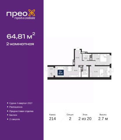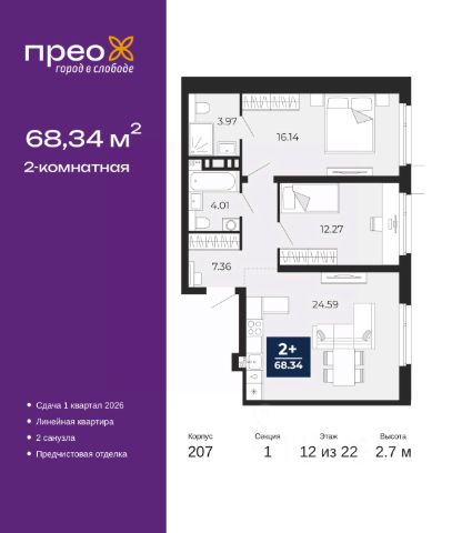 Успейте оформить бронирование по этой цене! Период предложения ограничен! Стоимость квартиры указана со скидкой, ваша экономия составит 434,000 RUB. По всем вопросам обращайтесь в офис продаж, наши менеджеры вам все расскажут! Продается 2-комн. квартира от застройщика с предчистовой отделкой в ЖК "Прео" на 6 этаже. Общая площадь: 68.34 кв.м., жилая: 28.41 кв.м., площадь просторной кухни-столовой: 24.59 кв.м. Комнаты изолированные, все окна выходят на одну сторону. В квартире два совмещенных санузла. Высота потолков 2.7 м. Дом монолитный, двухподъездный, переменной этажности, от 12 до 20 этажей. Квартира находится в 1-й секции высотой 12 этажей в корпусе 214. На этаже 8 квартир. В подъезде 1 пассажирский и 1 грузовой лифт. Окончание строительства - 4 квартал 2027 года. Оформление сделки по договору долевого участия. Преображенский — один из самых привлекательных районов для жизни! Это полностью самостоятельный жилой район с точки зрения инфраструктуры. Преображенский находится между Московским и Червишевским трактами в квартале улиц Закалужская — Вьюжная — Александра Протозанова. Не нужно ждать, когда появится инфраструктура — переезжайте на всё готовое. Вблизи расположены действующие школа и детский сад. В этом году откроется еще один сад, а в следующем году — школа. По соседству с Преображенским запланировано строительство городского парка "Комарово" площадью 38 гектар. За 10 минут можно доехать на автомобиле до крупных ТРЦ: "Лента", "Кристалл", "Леруа Мерлен", "Метро" и "Ашан". С 2018 года в районе открыт Соседский центр — пространство, созданное для формирования добрососедской среды, совместного досуга, общения и реализации соседских инициатив. Здесь проходят встречи соседей, а также сами жители района организовывают мероприятия. Организатором такого события может стать любой желающий. В квартирах выполнена качественная предчистовая отделка. Гладкие стены с финишным выравниванием по маякам. Ровный потолок для установки натяжного потолка. Установлены пятикамерные окна с двойным стеклопакетом (3 стекла). Дизайнерские холлы с видеонаблюдением, безбарьерным и прозрачным входом всегда светло и спокойно. На первом этаже есть просторные колясочные, где все жители могут оставлять свои коляски и велосипеды. В Преображенском есть всё, что нужно для активного отдыха и занятий спортом. Мы сделали большое футбольное поле с безопасным покрытием. Также установили хоккейный корт, который оборудован по всем необходимым стандартам. Во дворах можно делать упражнения на специальных площадках с турниками. Весь район мы обустроили велодорожками, которые связаны в единый маршрут. У нас есть сухие фонтаны, бьющие из земли, деревья, веревки, сетки, скалодром, газон, песок и резинка — осталось просто дать своему ребенку право на свободную игру. По-настоящему хорошие дворы — это те, которые дети предпочитают соцсетям и телевизору. Аккредитация в банках: ПАО "Банк Уралсиб", ПАО Банк "ВТБ", ОАО "Альфа-Банк", ПАО "Газпромбанк", "Сбербанк