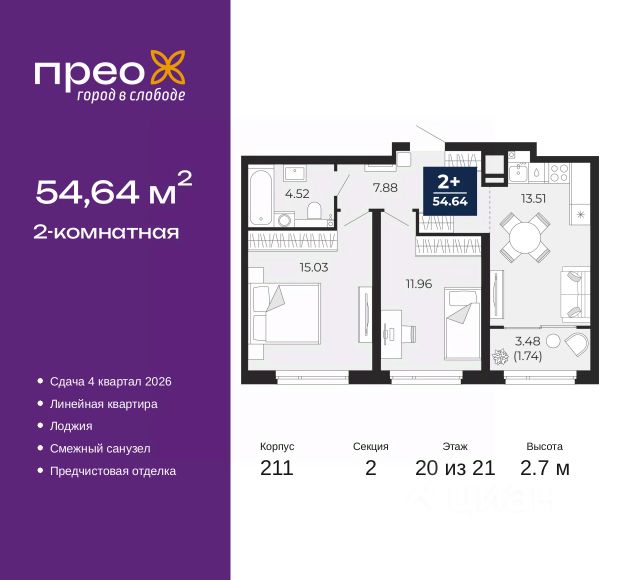 Двухкомнатная квартира от застройщика с предчистовой отделкой в ЖК "Республики 205" на 13 этаже. Общая площадь: 72.39 кв.м., жилая: 23.4 кв.м., площадь просторной кухни-гостиной: 24.5 кв.м. Угловая квартира, очень светлая, естественная вентиляция при открытии окон. В квартире один совмещенный и один раздельный санузел. Высота потолков 2.7 м. Купить квартиру можно с помощью программ покупки от застройщика Брусника: - ипотека по эксклюзивной ставке с помощью в получении положительного кредитного решения через сервис ипотечный брокер; - квартиры в рассрочку без процентов от застройщика Брусника; - обмен квартиры на новую. Получить одобрение ипотеки или рассрочку, а также осуществить обмен квартир можно онлайн. Дом монолитный, многоподъездный, переменной этажности, от 7 до 16 этажей. Квартира находится в 3-й секции высотой 16 этажей в корпусе 2. На этаже 7 квартир. В подъезде 2 грузовых лифта. Начало строительства - 1 квартал 2024 года. Окончание строительства - 1 квартал 2026 года. Оформление сделки по договору долевого участия. Район Проект расположен в границах улиц Пермякова, Энергетиков, Воровского и Республики. До центра города — 10 минут на машине. Рядом — автомобильная развязка на пересечении улиц Пермякова и Республики. В шаговой доступности есть школы, детские сады, поликлиники, крупный торговый центр, автовокзал и несколько скверов. Проект "Республики 205" — это проект комплексного развития территории, уникальный по своему наполнению. Переосмысляя бывшую территорию завода медицинского оборудования, мы создадим новое место силы — микрорайон, насыщенный деловой, развлекательной, рекреационной, игровой, образовательной и медицинской инфраструктурой. До каждого полезного сервиса здесь можно будет дойти за 15 минут. Локальными центрами "Республики 205" будут общественные пространства — скверы, парки, бульвары и площади. В границах нашего участка мы намерены разместить школу, рассчитанную на 1550 учеников, два детских сада на 300 мест и встроенный детский сад на 100 мест. В одном из цехов бывшего завода расположится креативный кластер "Кузница". Он станет площадкой для нескольких институций — галереи, лектория, книжного магазина-библиотеки, кинобара и точек креативного pop-up-ритейла. Пешеходные бульвары внутри района соединят между собой улицу ресторанов, детские и спортивные площадки, событийную площадь и летний кинотеатр. Идентификатор квартиры по базе застройщика: РСП-02-3-3. #zsm9sE Продается 2-комнатная квартира в Тюмени.