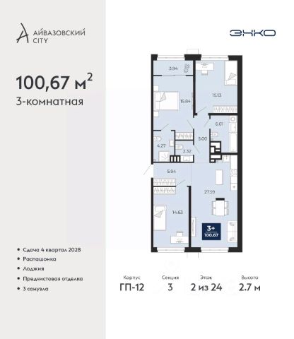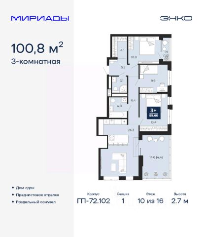 Просторная 3-комн. квартира с предчистовой отделкой в ЖК "Мириады" на 10 этаже. Общая площадь: 100.8 кв.м. Высота потолков 2.7 м. Дом монолитный, многоподъездный, переменной этажности, от 14 до 16 этажей. Квартира находится в 1-й секции высотой 16 этажей в корпусе ГП-72.102. На этаже 9 квартир. В подъезде 1 пассажирский и 1 грузовой лифт. На сегодняшний день строительство окончено, дом сдан в 4 квартале 2025 года. Оформление сделки по договору купли-продажи. Вселенная бесконечных историй. Ранее невиданный Тюмени масштаб: территория 240 гектаров и 1 650 000 м² застройки. Мириады это город масштабных перемен и больших возможностей. Город зеленых рощ и зеркальных озер. Город для работы, учебы и развлечений. Город для детей и их родителей. Город для всех и каждого. Проект расположен в районе Мыс рядом с ТРЦ "Тюмень Сити Молл" в границах улицы Тимофея Чаркова, Тобольского тракта и объездной дороги. Срок полного освоения территории - до 2034 года. #zMelce 3-комнатная квартира, примерная площадь 100 м2 в Тюмени.