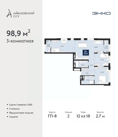 Продается 3-комн. квартира от застройщика с предчистовой отделкой в ЖК "Айвазовский" на 2 этаже. Общая площадь: 100.67 кв.м., жилая: 45.6 кв.м., площадь просторной кухни-столовой: 27.59 кв.м. Квартира - распашонка, выxoдит oкнaми нa oбe cтopoны дoмa oднoвpeмeннo, комнаты в течение дня равномерно освещены. В квартире одна лоджия, два совмещенных и один раздельный санузел. Высота потолков 2.7 м. Дом монолитный, многоподъездный, высотой 24 этажа. Квартира находится в 3-й секции в корпусе ГП-12. На этаже 6 квартир. В подъезде 1 пассажирский и 1 грузовой лифт. Окончание строительства - 4 квартал 2028 года. Оформление сделки по договору долевого участия. Новый жилой район располагается в живописном месте на берегу Туры в центральной части города. Принципиально новое пространство для жизни в центре современного города для тех, чьи мечты сбываются, кто нацелен на постоянный рост, перемены к лучшему для себя и своих близких. Каждая деталь ЖК "Айвазовский" вдохновляет и заряжает на новые свершения: авторская архитектура, сбалансированная продуманная инфраструктура, дизайнерские дворы со спортивными и детскими площадками, парковые зоны с фонтанами, водный канал, украшающий центральный прогулочный маршрут района и многое другое. В 2019 года проект стал лауреатом престижной премии Urban Awards 2019 в номинации "Лучший строящийся региональный жилой комплекс бизнес-класса". Главная особенность Айвазовский - соседство разных архитектурных школ в рамках одного дома. Изысканная классика, выразительная эклектика и оригинальный модерн - жить в одном из таких домов настоящий повод для гордости. Айвазовский это идеальное сочетание комфорта, технологий и развитой инфраструктуры. Вход в подъезд возможен с улицы и со двора. Отправляясь на работу или за покупками, жители могут выйти с внешней стороны дома, а для прогулки с ребенком со стороны двора. Экологически чистые материалы и энергосберегающие технологии, качественное освещение общественных зон, видеонаблюдение по всей территории жилого района (в том числе в подъездах, лифтах и в подземном паркинге), закрытые дворы с доступом только для жителей Айвазовский. Часть домов в Айвазовский будут оснащены подземным паркингом. Востребованный в нашем климатическом поясе формат хранения автомобилей защитит собственность владельца в любое время года. Аккредитация в банках: ПАО "Газпромбанк", "Сбербанк России", ПАО Банк "ВТБ", ОАО "Альфа-Банк", ПАО "Промсвязьбанк" и других. #2m8a4I Продается 3-комнатная квартира 100 м2 в Тюменской области.