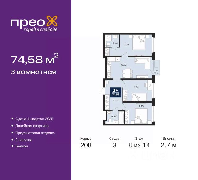 Продаётся квартира площадью 72.60 м2 в жилом комплексе "Айрис". Квартира находится на 3 этаже дома, который будет введен в эксплуатацию в 3 квартале 2027 года. Жилая площадь квартиры 28.90 м2, площадь просторной кухни — 21.00 м2. Среди особенностей планировки — изолированные комнаты с окнами на одну сторону, 1 совмещённый санузел. Жилой комплекс "Айрис" — это: фиджитал-квартал в Тюмени дома высотой от 7 до 25 этажей квартиры с системой "Умный дом" цифровые технологии как элемент благоустройства Срок сдачи — III кв. 2027 Окружение В нескольких минутах ходьбы от дома — парк "Комарово" с волейбольной площадкой, открытым кинотеатром, зонами для барбекю и катком. Неподалеку от Airis находится центр иппотерапии, где можно покататься на лошадях и взять уроки верховой езды. На территории Airis появится собственный парк с прогулочными аллеями. Инфраструктура В 5-10 минутах от квартала открыты 2 детских сада и гимназия. На шопинг можно отправиться в торговые комплексы "Колумб" и "Кристалл" — они находятся недалеко от дома. Благоустройство Уютный двор — приватное пространство для жителей. В беседках можно будет почитать книгу в тишине, а в тени деревьев устроиться на пикник. На крыше многоуровневого паркинга будет лаунж-зона с кинотеатром, баскетбольная площадка и воркаут-пространство, где можно позаниматься с виртуальным тренером — достаточно отсканировать код. Лобби Интерьеры лобби выполнены в пастельных тонах с элементами фиджитал-решений. Для отдыха и ожидания гостей создана лаунж-зона. Также есть гостевые санузлы. Колясочные Возвращайтесь налегке после прогулки с малышом — оставить коляску можно в специальном помещении на первом этаже. Кладовые Для сезонных и габаритных вещей предусмотрены отдельные кладовые на цокольном этаже. В каждом помещении уже проведено электричество и выполнена стяжка пола. Паркинг На территории — два многоуровневых наземных паркинга. Один из них примыкает к домам — из него можно напрямую пройти в парадные. Планировки Планировки квартала — от компактной студии до сити-хауса с собственным палисадником — соответствуют любым жизненным сценариям. Можно выбрать квартиры с террасами и готовыми дизайнерскими интерьерами. Продам 3-комнатную квартиру до 10 млн. рублей в Тюменской области.