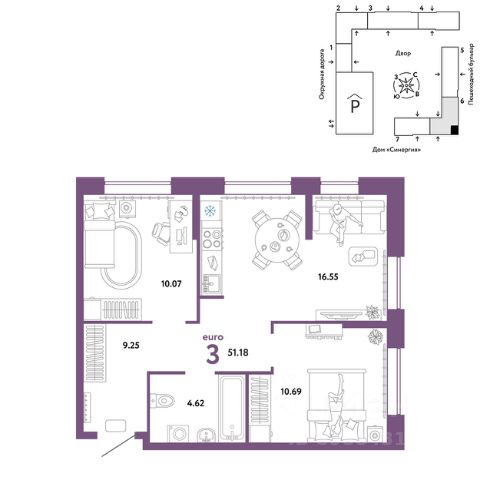 Жилой комплекс "Айрис" — это: - фиджитал-квартал в Тюмени - дома высотой от 7 до 25 этажей - квартиры с системой "Умный дом" - цифровые технологии как элемент благоустройства Окружение В нескольких минутах ходьбы от дома — парк "Комарово" с волейбольной площадкой, открытым кинотеатром, зонами для барбекю и катком. Неподалеку от Airis находится центр иппотерапии, где можно покататься на лошадях и взять уроки верховой езды. На территории Airis появится собственный парк с прогулочными аллеями. Инфраструктура В 5-10 минутах от квартала открыты 2 детских сада и гимназия. На шопинг можно отправиться в торговые комплексы "Колумб" и "Кристалл" — они находятся недалеко от дома. Благоустройство Уютный двор — приватное пространство для жителей. В беседках можно будет почитать книгу в тишине, а в тени деревьев устроиться на пикник. На крыше многоуровневого паркинга будет лаунж-зона с кинотеатром, баскетбольная площадка и воркаут-пространство, где можно позаниматься с виртуальным тренером — достаточно отсканировать код. Лобби Интерьеры лобби выполнены в пастельных тонах с элементами фиджитал-решений. Для отдыха и ожидания гостей создана лаунж-зона. Также есть гостевые санузлы. Колясочные Возвращайтесь налегке после прогулки с малышом — оставить коляску можно в специальном помещении на первом этаже. Кладовые Для сезонных и габаритных вещей предусмотрены отдельные кладовые на цокольном этаже. В каждом помещении уже проведено электричество и выполнена стяжка пола. Паркинг На территории — два многоуровневых наземных паркинга. Один из них примыкает к домам — из него можно напрямую пройти в парадные. Планировки Планировки квартала — от компактной студии до сити-хауса с собственным палисадником — соответствуют любым жизненным сценариям. Можно выбрать квартиры с террасами и готовыми дизайнерскими интерьерами. Продается 3-комнатная квартира 50 м2 в Тюмени.