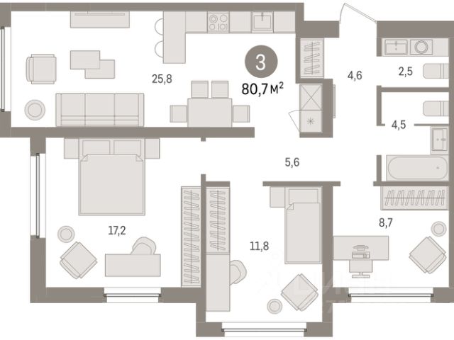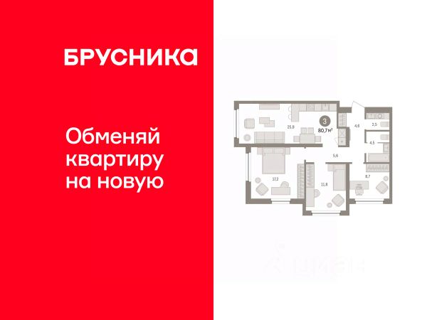 Трехкомнатная квартира от застройщика с предчистовой отделкой в ЖК "Мириады" на 3 этаже. Общая площадь: 79.9 кв.м. Высота потолков 2.7 м. Дом монолитный, двухподъездный, переменной этажности, от 14 до 18 этажей. Квартира находится в 1-й секции высотой 18 этажей в корпусе ГП-72.104. На этаже 6 квартир. В подъезде 1 пассажирский и 1 грузовой лифт. В настоящее время строительство завершено, дом сдан в 4 квартале 2025 года. Оформление сделки по договору купли-продажи. Вселенная бесконечных историй. Ранее невиданный Тюмени масштаб: территория 240 гектаров и 1 650 000 м² застройки. Мириады это город масштабных перемен и больших возможностей. Город зеленых рощ и зеркальных озер. Город для работы, учебы и развлечений. Город для детей и их родителей. Город для всех и каждого. Проект расположен в районе Мыс рядом с ТРЦ "Тюмень Сити Молл" в границах улицы Тимофея Чаркова, Тобольского тракта и объездной дороги. Срок полного освоения территории - до 2034 года. #26ElaB Продам 3-комнатную квартиру 80 м2 (квадратных метров) в Тюмени.