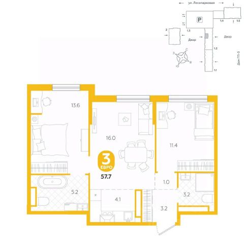 Квартира располагается в ГК "Чистые Пруды" от "Паритет девелопмент". Это флагманский проект компании в Тюмени. Расположение вдали от шумных улиц и оживленного центра создает ощущение жизни на природе и окружает тишиной и спокойствием. Есть вся необходимая социальная и коммерческая инфраструктура: магазины и сфера услуг на первых этажах. Школы, сады, поликлиника, парки в шаговой доступности. Квартал строится в районе Новой Лесобазы. Рядом выезд на объездную, что существенно экономит время. Поездка до центра города на автомобиле занимает 15-20 минут. Городские кварталы "Чистые Пруды" сформирован из домов переменной этажности и многоуровневых паркингов. Ввод 1 очереди строительства запланирован на II кв. 2028 года. Всё благоустройство квартала представлено двумя функциональными зонами: приватная внутри дворовая и общественная. Каждый закрытый двор имеет выход на единую променадную зону - бульвар. Концепция благоустройства основана на принципе модульности, что формирует основную идею приватности. Приватность проекта подчеркивает его особенный климат внутри. Модульное благоустройство позволит максимально эффективно использовать пространство двора и удовлетворить потребности различных категорий жителей. В квартирах базово выполнена улучшенная черновая отделка, которая включает в себя: выровненные стены, стяжка пола с шумоизоляцией, горизонтальная разводка отопления, установлены счетчики с телеметрией, окна с 5-камерным профилем и надежные входные двери. При желании можно добавить ремонт от застройщика и включить его в стоимость ипотеки, что позволит сэкономить на стройматериалах и переехать сразу после получения ключей. Характеристики квартиры: этаж - 9 количество комнат - 3 номер помещения - 212 площадь квартиры - 57,7 кв.мГармоничные пропорции и большие окна наполняют пространство светом, создавая уютную атмосферу. Умное зонирование позволяет удобно организовать как рабочую, так и жилую зоны, что особенно важно для современных жителей. Санузел спроектирован с учетом всех потребностей: здесь есть ванна и место для стиральной машины. Каждый метр квартиры используется с максимальной эффективностью, что делает эту планировку отличным выбором для тех, кто ценит комфорт и удобство.
