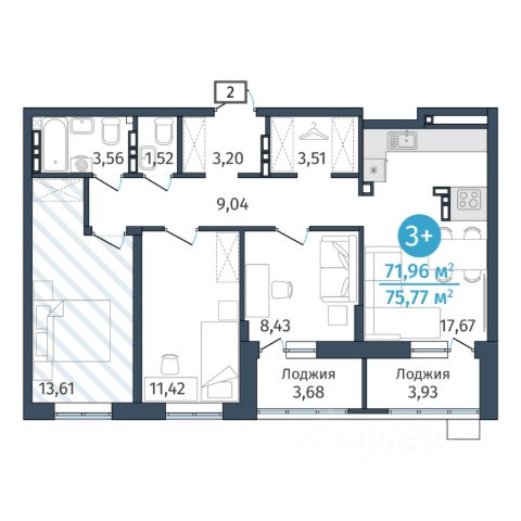 3-комнатная квартира в ЖК "Крылья". Адрес: г. Тюмень, с. Горьковка, ул. Центральная 25к2, этаж 2, номер помещения 36 Площадь квартиры 60.97 м2 . Высота потолка 2,7 м. Функциональная двухкомнатиная квартира с большой кухней-гостиной и двумя санузлами. Комнаты геометрически правильной формы.
